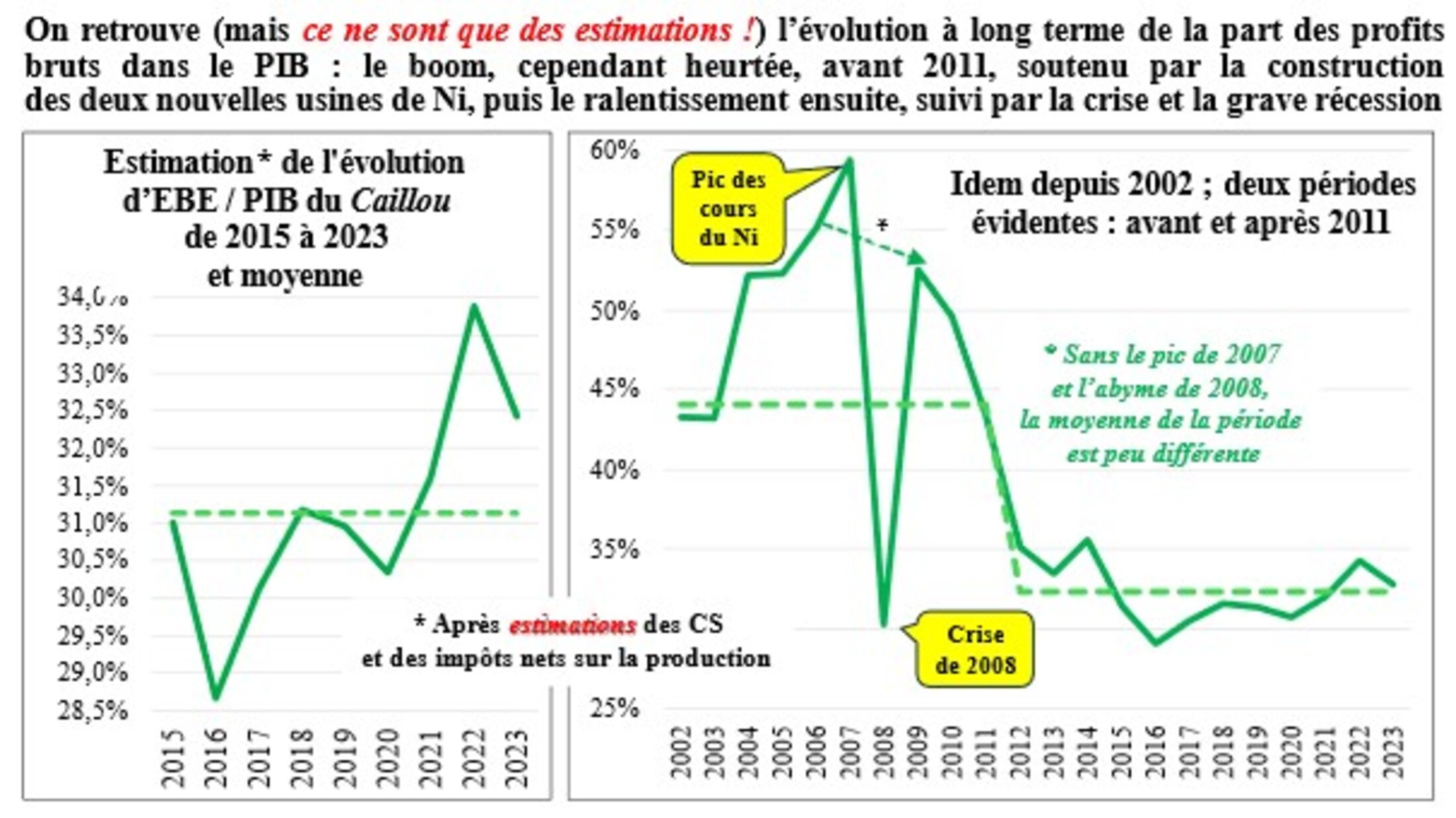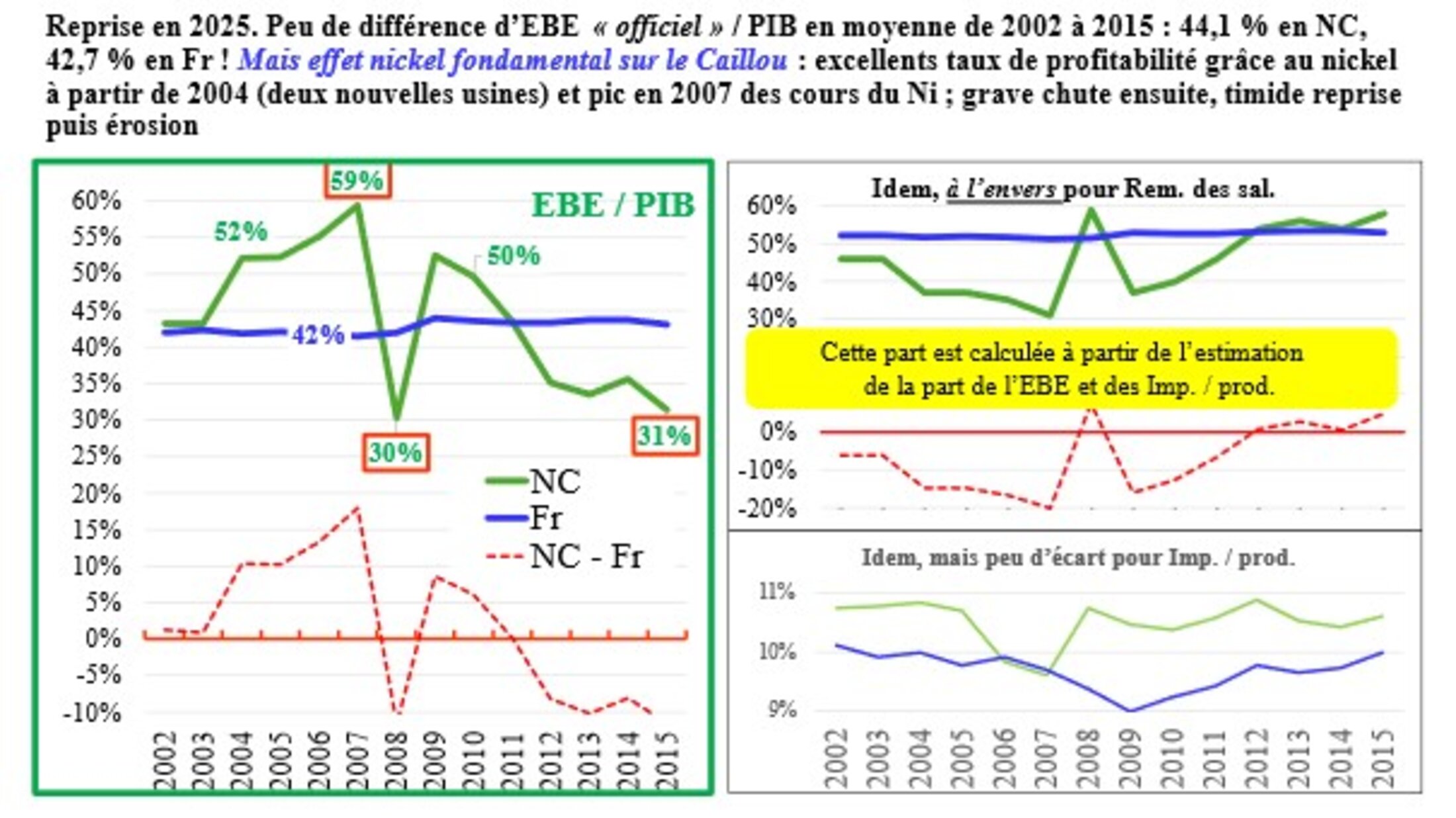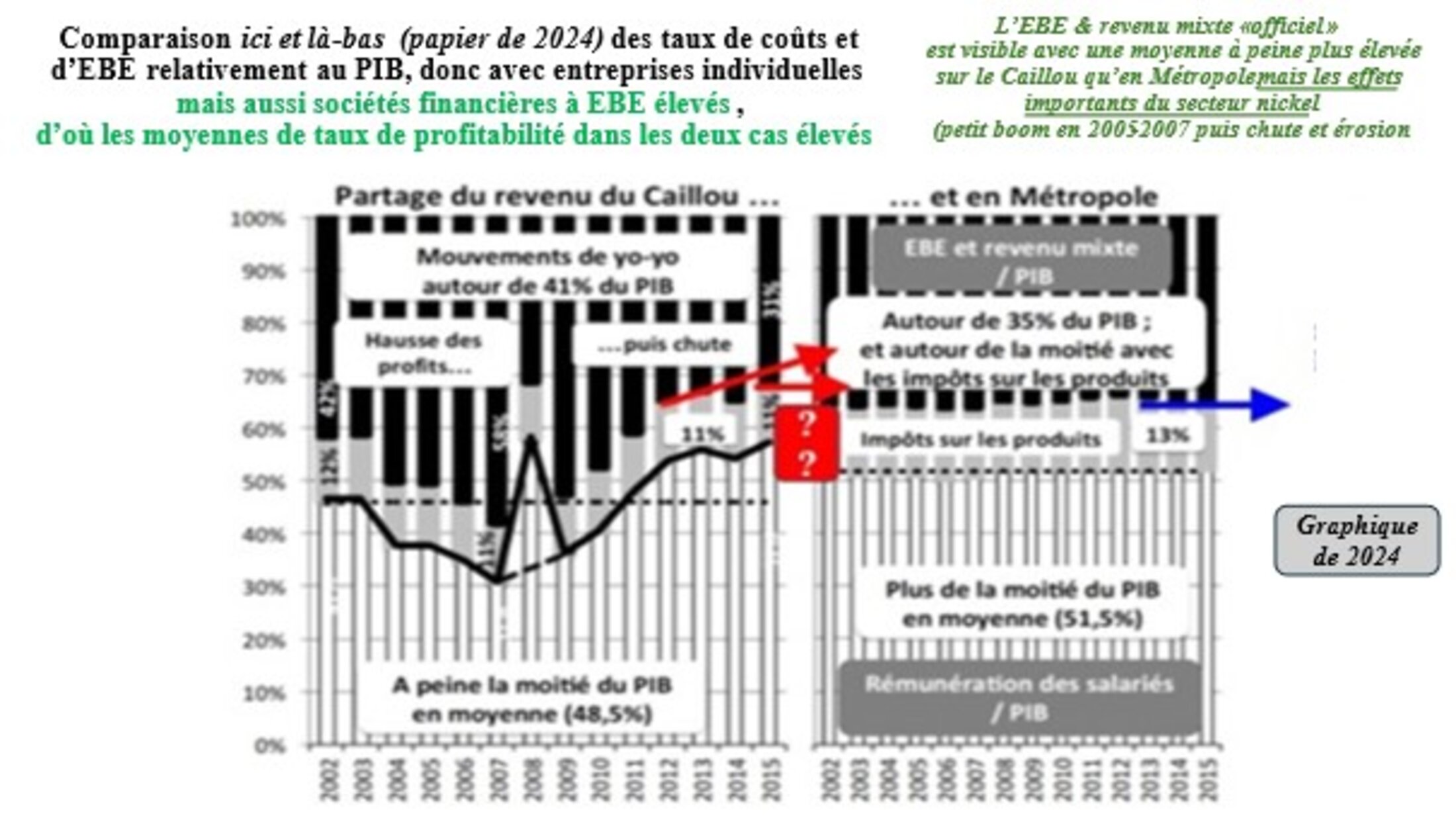 En moyennes sur cette période, si les données sont à peu près fiables, le Caillou ne faisait apparaître qu’un très léger avantage en termes de profitabilité globale de tous les acteurs macroéconomiques (la constante de Bowley est arrivée dans le Pacifique...) : les profits ne se goinfraient pas beaucoup plus, sur longue période, sur le Caillou qu’en Métropole ! En revanche le rôle du nickel est (était...) essentiel : il boostait l’EBE / PIB en années de vaches grasses (et comment !) mais le faisait s’effondrer ou fléchir en années de vaches maigres. Le taux de profitabilité, et sans aucun doute, le taux de profit, s’est écroulé après 2015 sur le Caillou. Avec les inégalités sociales et surtout ethniques structurelles, le terreau était là et bien là : la jeunesse kanak s’est ainsi révoltée le 13 mai 2014.