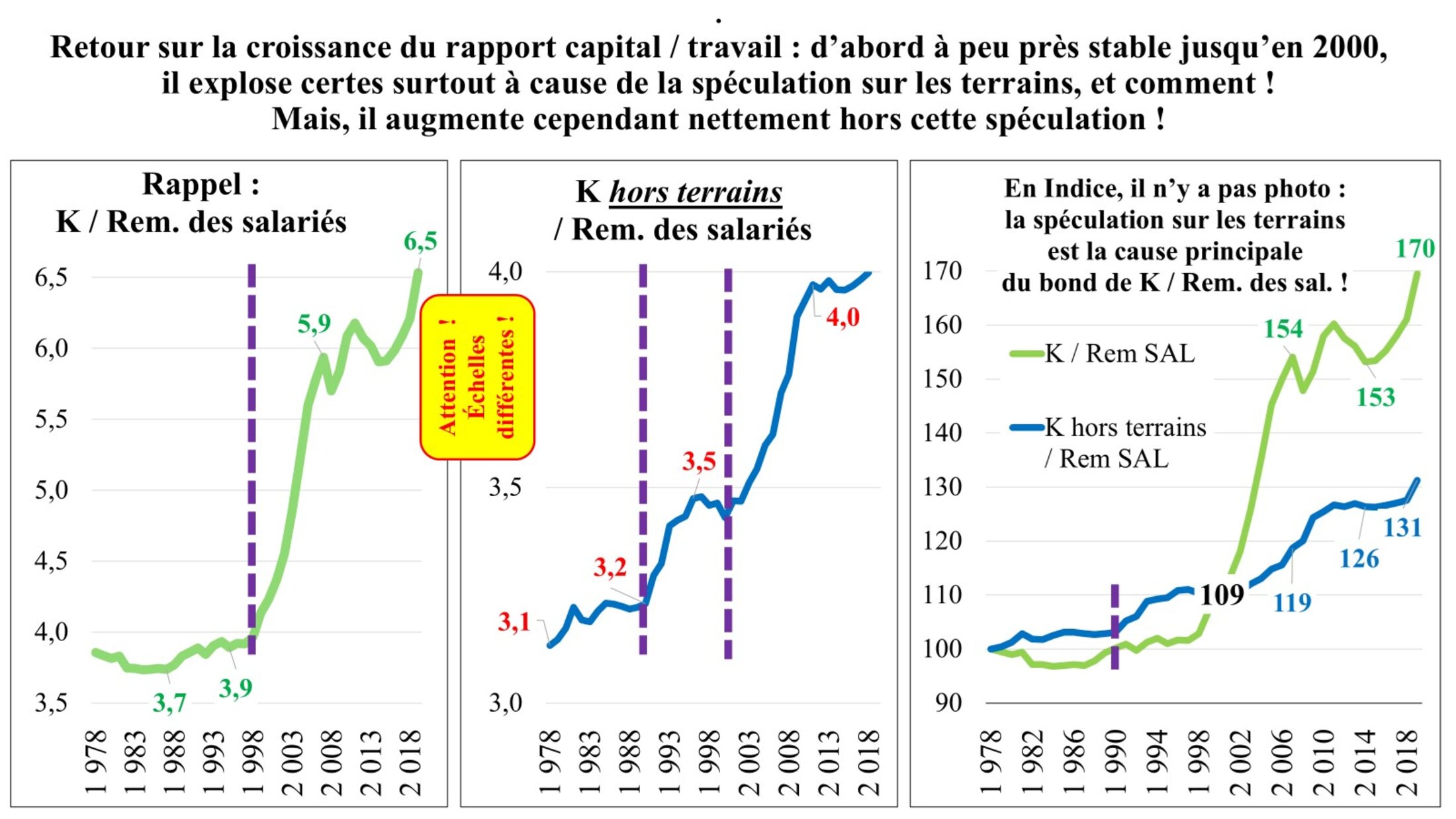 Elle saute aux yeux dans le graphique qui suit. L’équivalent du taux de composition organique qui tournait, avec terrains, autour de 4€ de K pour 1€ de Rémunération des salariés, passait rapidement à près de 6 en 2007 ; après la crise déclenchée en 2008, on atteignait péniblement 6,5 en 2019 : la majeure partie du boom concernait donc seulement la dizaine d’années 1998-2008. Avec K sans terrain, on passe d’un peu plus de 3 à 4. Il n’y a donc pas que la dynamique de l’investissement en FBCF sur la période ; il y a aussi la spéculation sur les terrains ; mais la dynamique de l’investissement a aussi produit ses effets. La rupture se produit en 1998 mais se tasse après 2008.