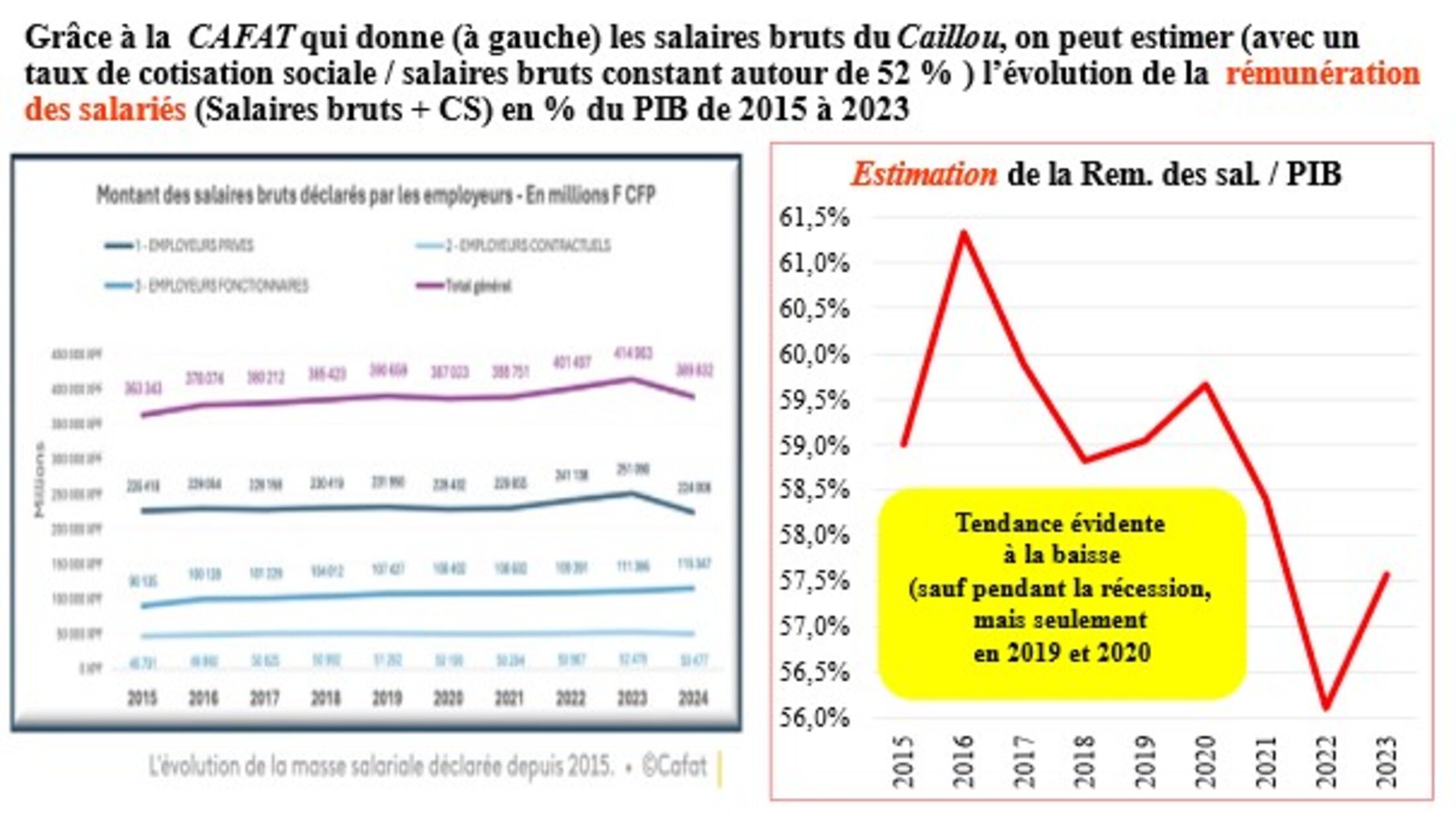 Mieux concernant l’économie (et en plein dans le mille pour ce billet !) NC 1ère nous donne, grâce à la conférence sociale et fiscale organisée par le gouvernement et avec données de la CAFAT, l’évolution des salaires bruts de 2015 à 2024. Ce qui permet d’aller un peu plus loin (mais avec des estimations qui nous sont propres) qu’indiqué plus haut : la part de l’EBE dans le PIB continue en gros à un bas niveau, depuis 2012, bien plus bas que son équivalent en Métropole.