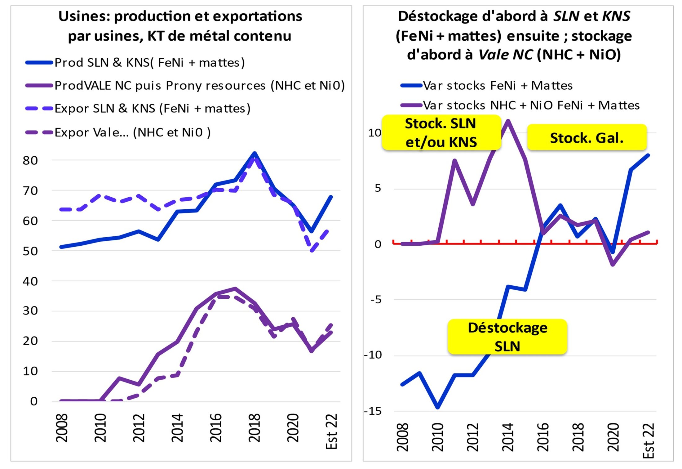 Les productions mondiale et calédoniennes présentaient en 2008 trois phases depuis la fin des années 70 : croissances en gros parallèles pendant 20 ans ; ralentissement sur le Caillou qui stagnait en fluctuant jusqu’en 2009 (il est vrai avec la seule SLN comme usine) alors que la production mondiale était plus contradictoire ; enfin les deux reprises de nouveau concomitantes avant les yo-yo récents calédoniens. De 2009 jusqu’au milieu des années 2010, la production mondiale avait presque doublé, et de manière régulière ; les usines du Caillou avaient en revanche vu leur production diminuer après 2017, profitant mal de la reprise des cours. Le cauchemar ne s’arrêtera qu’en 2022 !