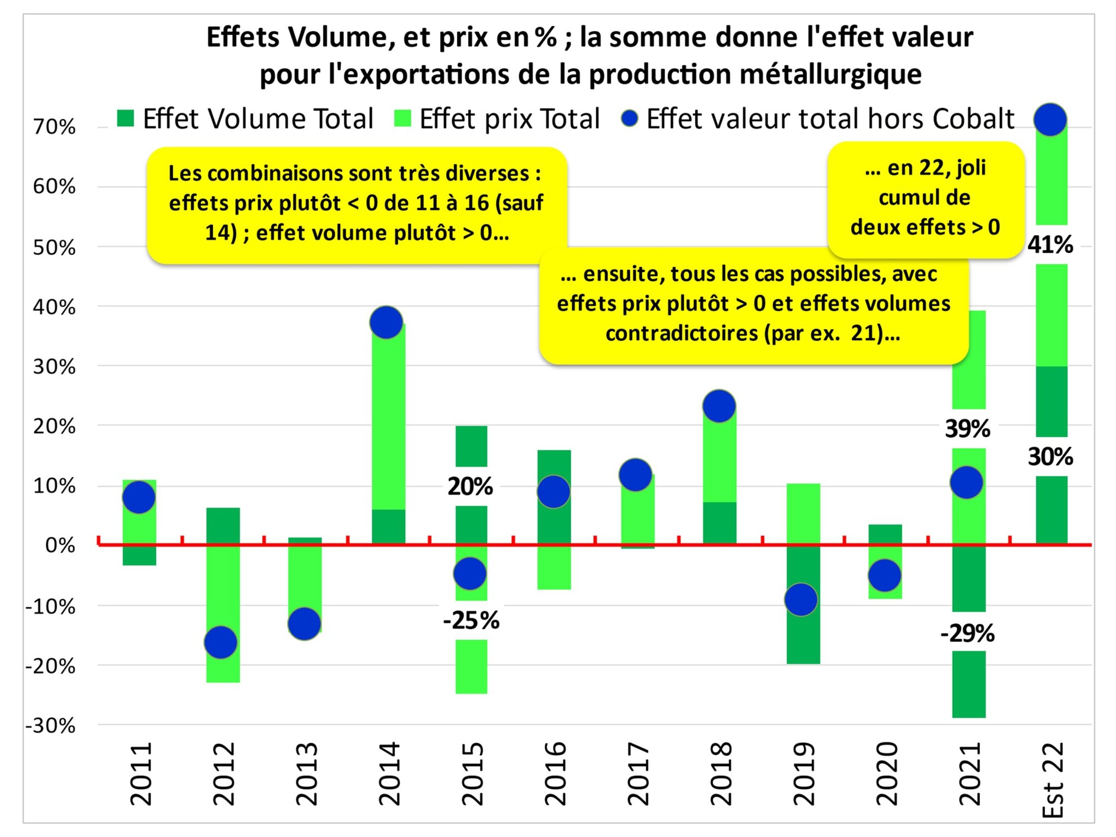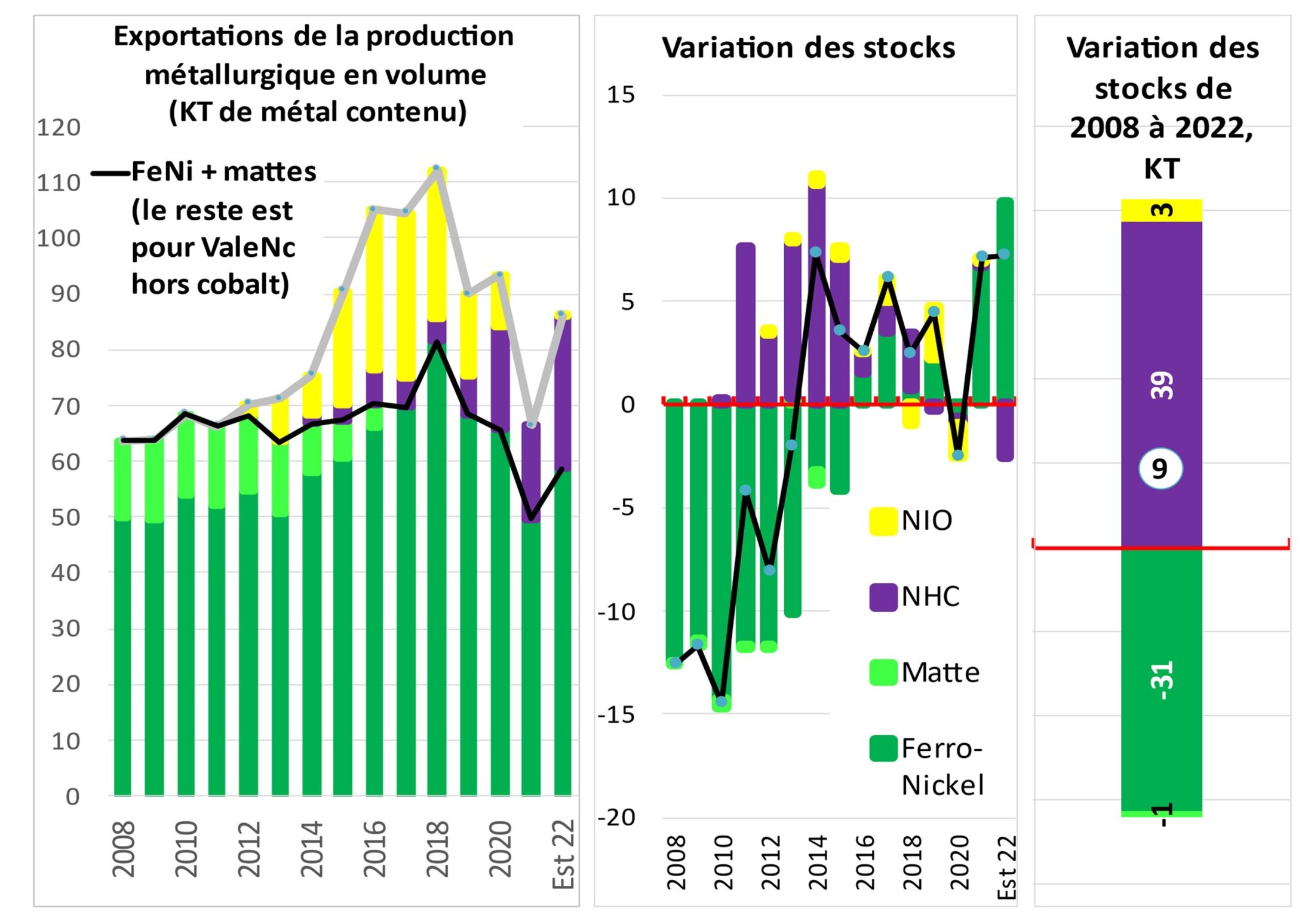 Enfin, l’évolution des exportations en valeur est différente de celles en volume, selon la fluctuation des cours et prix (un peu différents des cours au LME) effectifs du nickel : en général inférieurs, surtout depuis 2021.