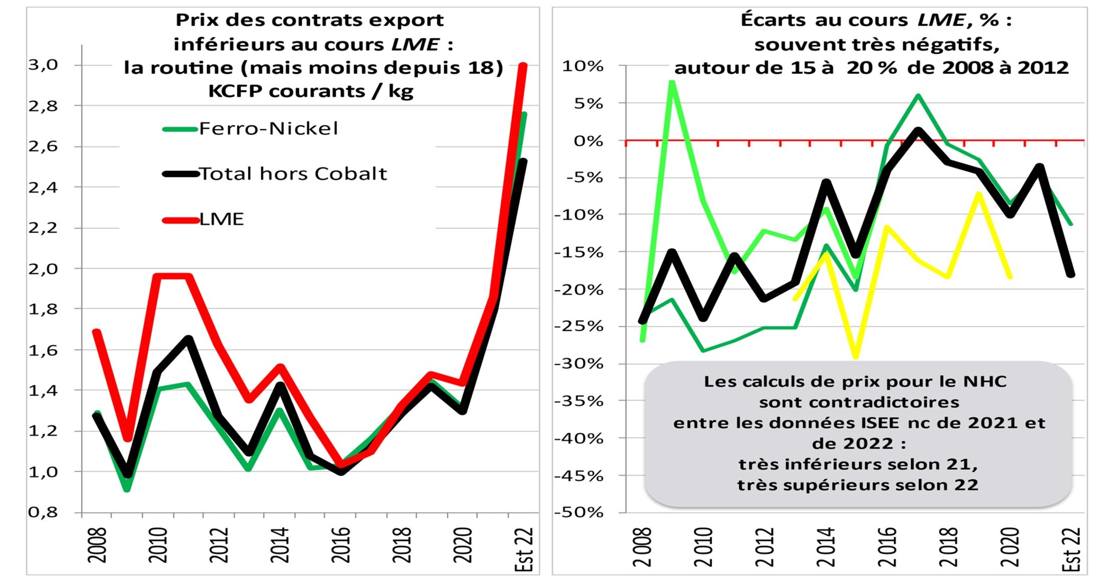 Malgré la disparition des mattes de la SLN après 2016, la production pyrométallurgique de cette dernière, puis, en 2016, de KNS, reste largement dominante en volume, malgré l’arrivée de la production hydrométallurgique de Vale NC en 2011 ; et avec des variations de stocks entre la production et les exportations très différente par période. Mais, en volume, la période de 2018 à 2021 est ainsi celle d’une grave récession des usines. Malgré la hausse des prix, il faudra attendre 2022 pour que la chute, même en valeur, s’arrête ! Et l’écart négatif, déjà ancien, entre les prix des contrats et les cours au LME (et au SHFE de Shanghai) n’y est pour rien.