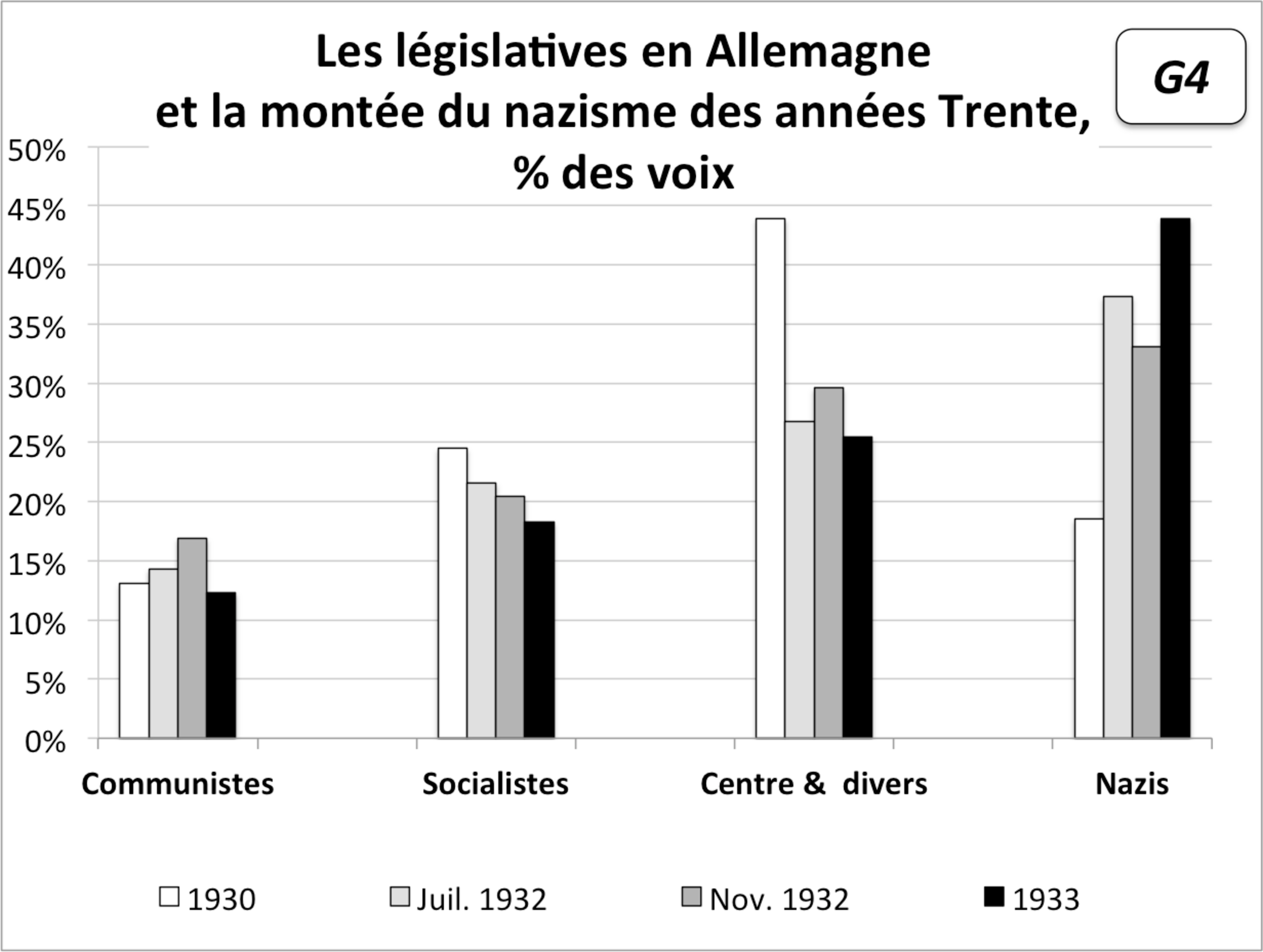 Allons refaire un tour du côté de l’Allemagne du début des années Trente… Pourquoi cette Allemagne et cette époque ? Juste pour voir… (voir encore les graphiques G4 et G5). Curieux, non ? On retrouve en gros ces trois tiers pour les deux législatives de 1932[3] : avec les deux gauches irréconciliables (les sociaux-démocrates dominants du SPD et les communistes du KPD) ; le Zentrum qui voulait faire le pont entre la gauche non communiste et la droite non nazie ; enfin « last but not least » comme disent les pédants en anglais (mais c’est plus précis que la traduction courante « enfin et surtout ») le dernier mais pas le moindre donc : Hitler. C’est pas tous les jours que l’on rencontre cette histoire de trois-tiers. Quand on vous dit que l’histoire bégaie !