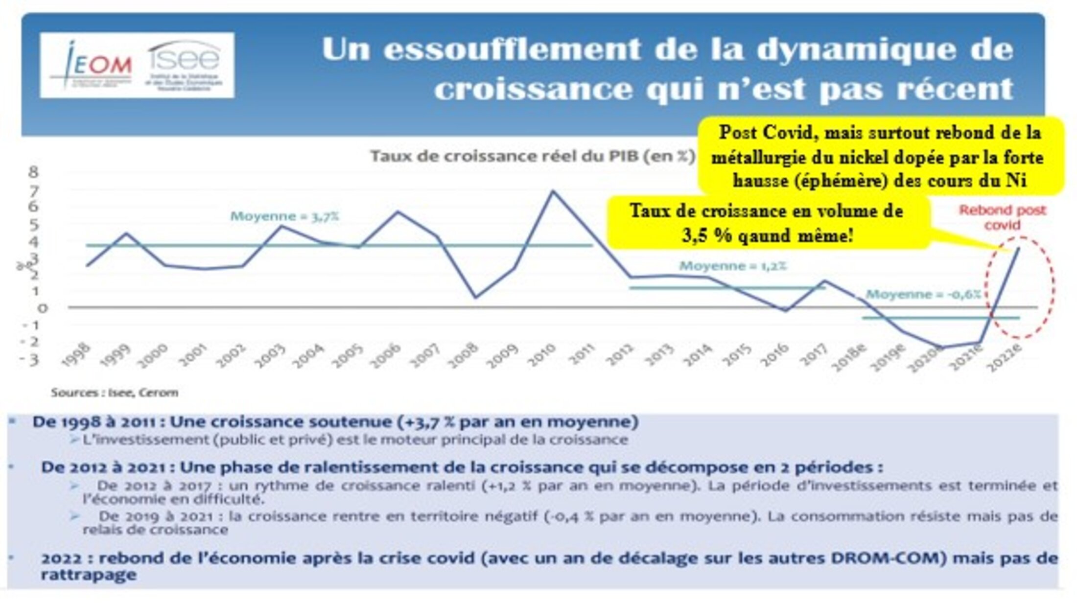 1 – La situation économique calédonienne est en effet « fin mal barrée » comme on dit sur l’archipel ; mais il n’y a pas que l’insurrection commencée le 13 mai qui n’a duré, dans sa phase aiguë, que deux semaines : tout avait commencé avant, en 2023, singulièrement en fin d’année et au premier trimestre 2024