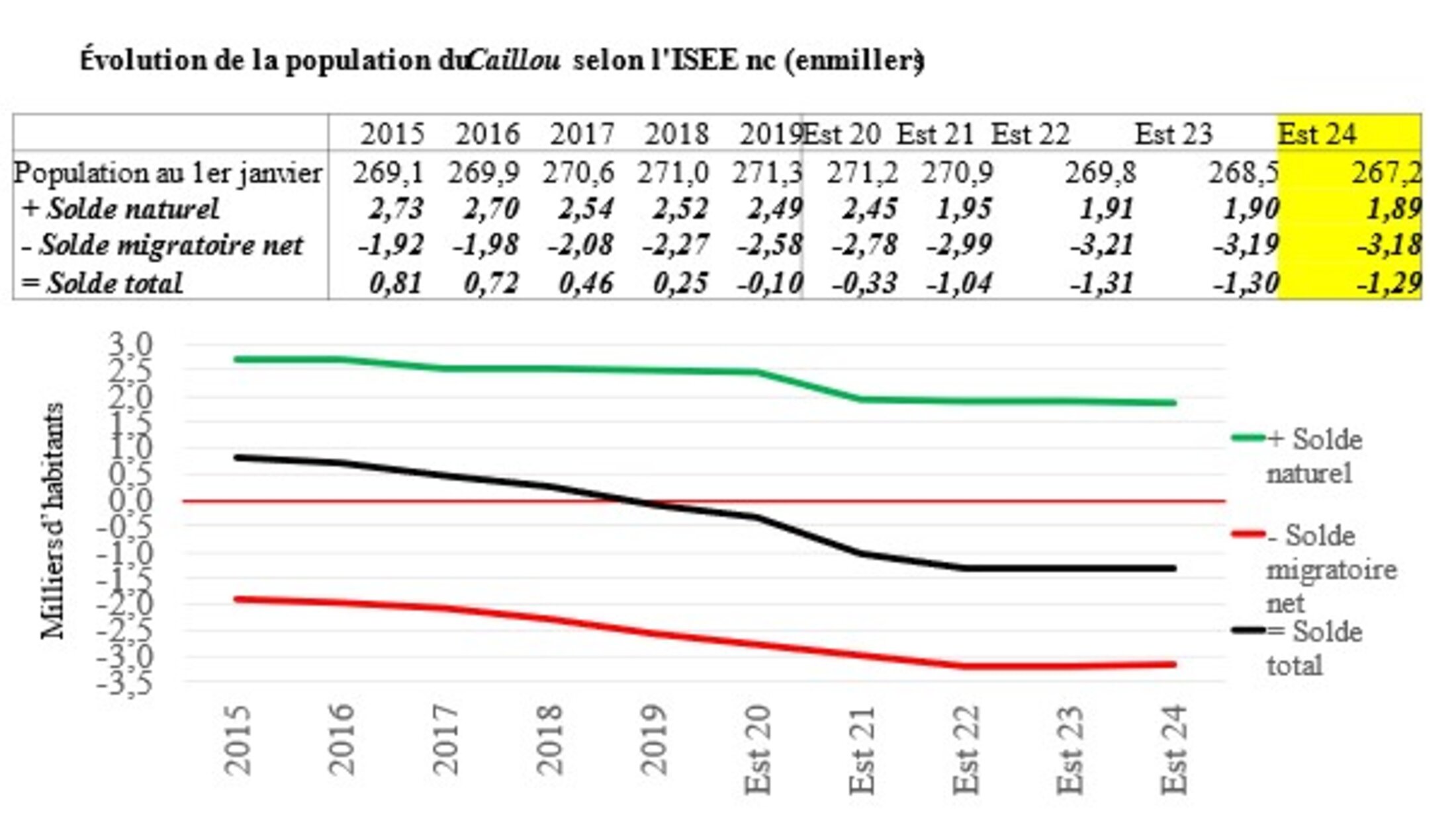 Cette analyse précise de l’ISEE apparaît dans le tableau suivant ; nous avons en outre estimé, dans ce tableau, l’année 2024 avec la même méthode (à comparer avec le prochain recensement de cette année). Selon l’ISEE, il y aurait toujours autour de 2,8 à 3,2 milliers de départs nets annuels (l’ISEE projetant l’aggravation perçu de 2014 à 2019) accompagnés d’une chute du solde naturel (toujours inférieur, selon l’ISEE, au solde migratoire net) qui se stabiliserait à partir de 2022. Résultat : la population moyenne baisserait en effet en cinq ans de 2018 à 2023, de 1,2 %… mais pas de 10 % !