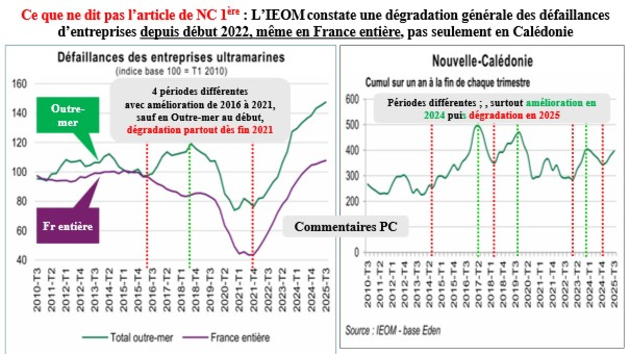La dernière analyse de l’IEOM venait juste de sortir le 28 novembre 2025, Tendances conjoncturelles - 3e trimestre 2025 (n° 444, datée de décembre 2025) publication titrée La Nouvelle-Calédonie reste confrontée à une situation économique très dégradée.[Je souligne, PC].