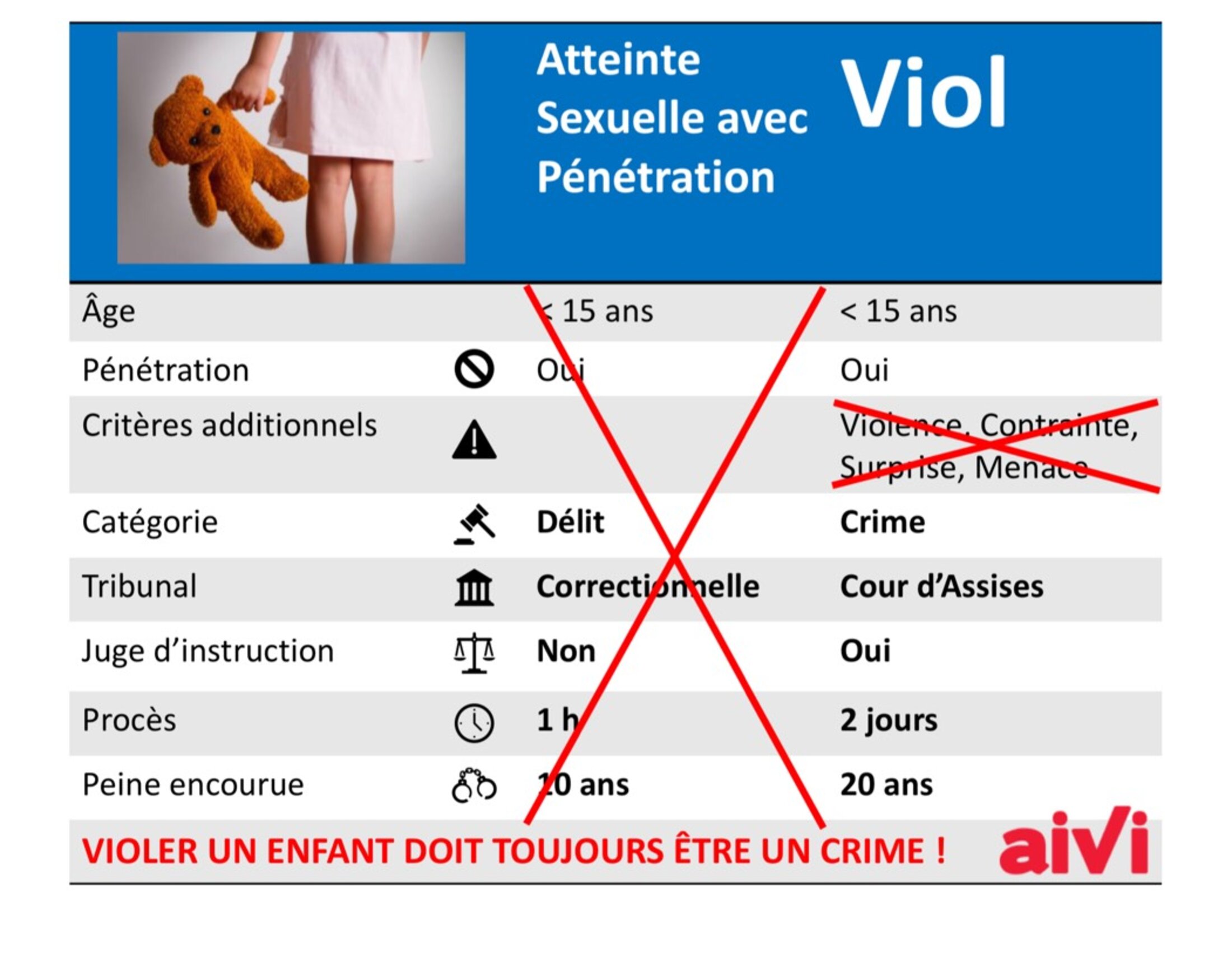 De nombreuses associations réclament que l'atteinte sexuelle sur mineur soit supprimée de notre Code pénal et que la définition du viol soit modifiée de façon à ce qu'aucun enfant de moins de 15 ans ne sont considéré comme "consentant" par la justice.