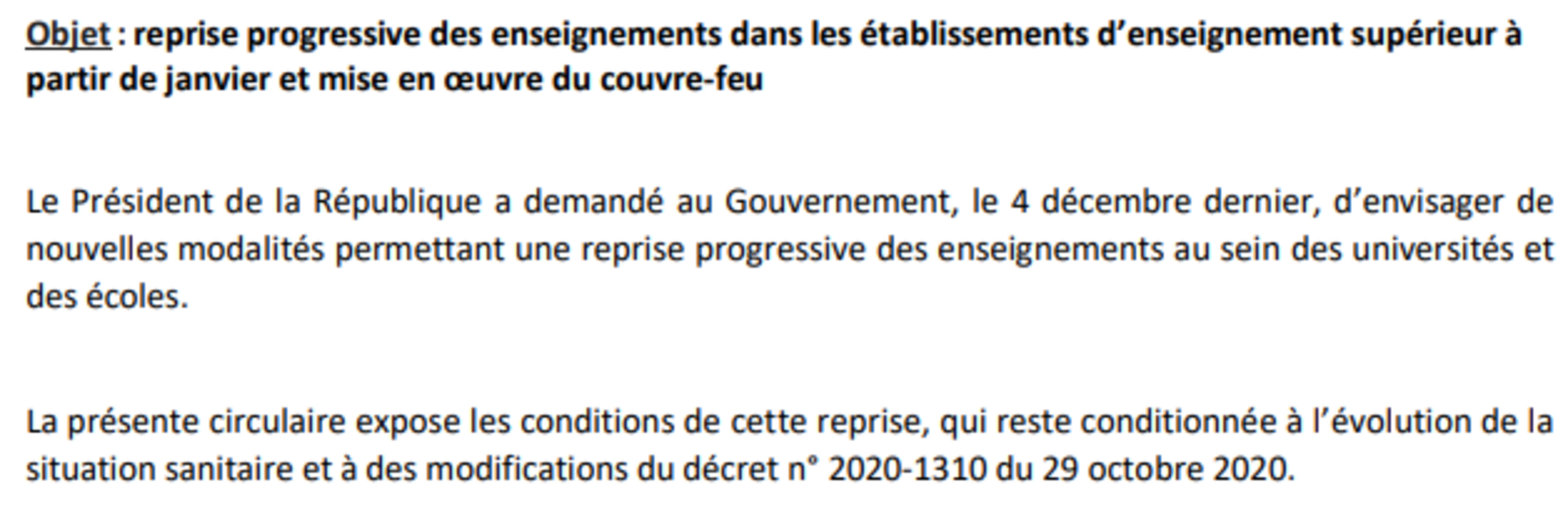 D’autre part, la circulaire ministérielle a indiqué – ce qui est une évidence – que tout retour des étudiants sur les campus est conditionné au préalable par une modification par le Premier ministre des termes de l’article 34 du décret du 29 octobre 2020 : la circulaire ministérielle ne peut précéder des assouplissements hypothétiques susceptibles d’être apportés au principe d'interdiction d'accès posé par décret du Premier ministre, celui-ci ayant une valeur juridique supérieure à celle-là. Sans cette modification initiale du décret du Premier ministre, il est rigoureusement interdit aux présidents et directeurs des établissements de l’enseignement supérieur d’ouvrir aux étudiants - quelle que soit leur situation personnelle - les portes des salles de cours et amphithéâtres, et même de commencer à envisager d’appliquer cette circulaire ministérielle caricaturalement macronienne dans sa perversité.