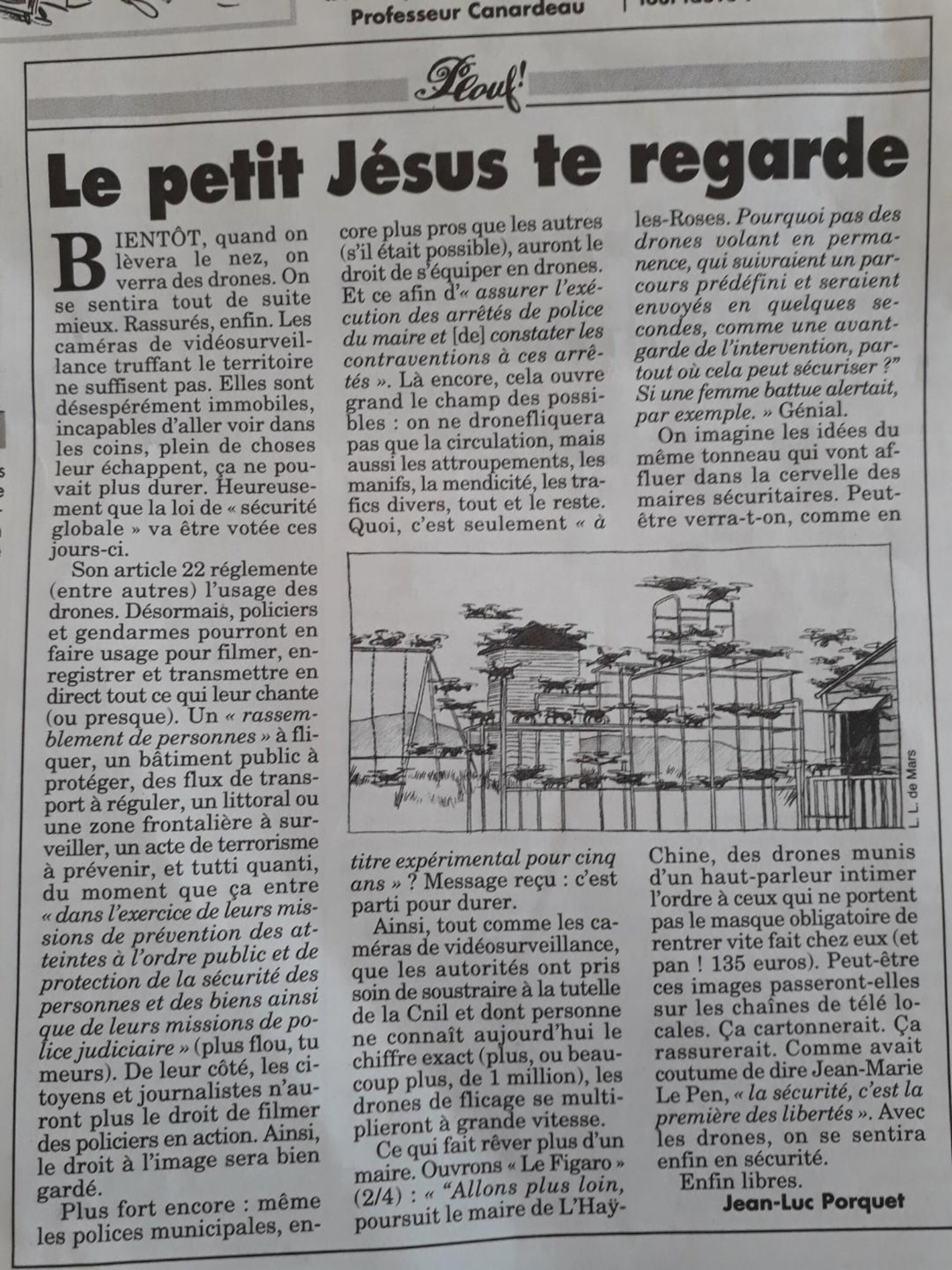 Tel est l’objet de l’article 22 de la loi « sécurité globale », qui organise et partant légitime l’usage des drones à deux niveaux, là encore dans un silence assourdissant de l’opinion publique à l’exception d’un article du Canard enchaîné (« Le petit Jésus te regarde », 31 mars 2021).