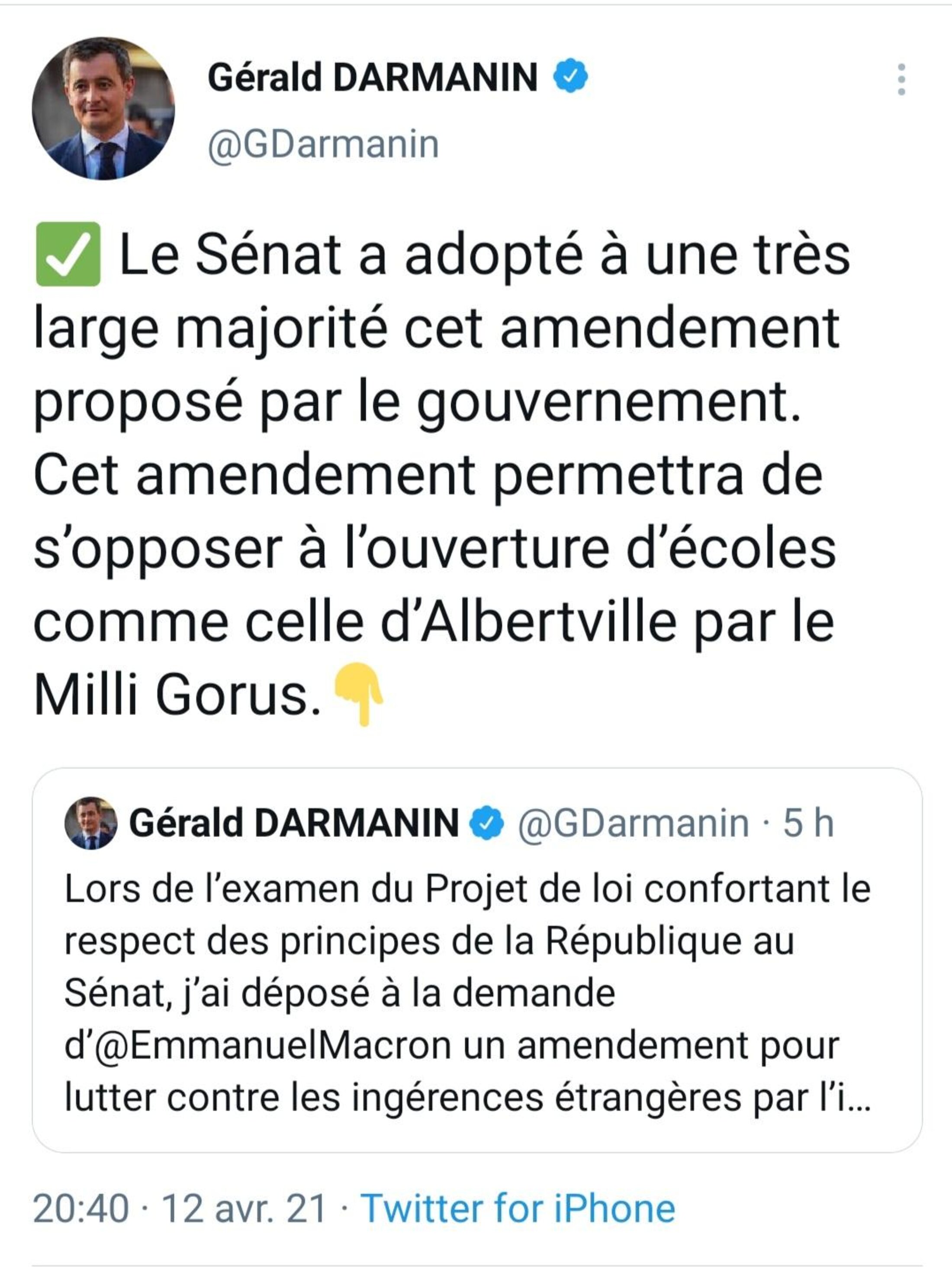 Le samedi 10 avril, le président de la région Auvergne-Rhône-Alpes, Laurent Wauquiez a diffusé dans la presse locale une lettre envoyée au président de la République exigeant « d’empêcher l’installation » d’une école musulmane dont la demande de permis de construire dans la commune d’Albertville (Savoie) venait d'être validée par le tribunal administratif ; il suffisait de demander : 48 heures plus tard, le lundi 12 avril, un amendement de dernière minute au projet de loi « séparatisme » présenté par le ministre de l’Intérieur sur ordre du président de la République est adopté par le Sénat, autorisant les préfets à s’opposer (sans effet rétroactif) à l’ouverture d’écoles privées « pour des motifs tirés des relations internationales de la France (sic) ou de la défense de sa souveraineté (sic) », c'est-à-dire sur des bases arbitraires, relatives et contingentes…