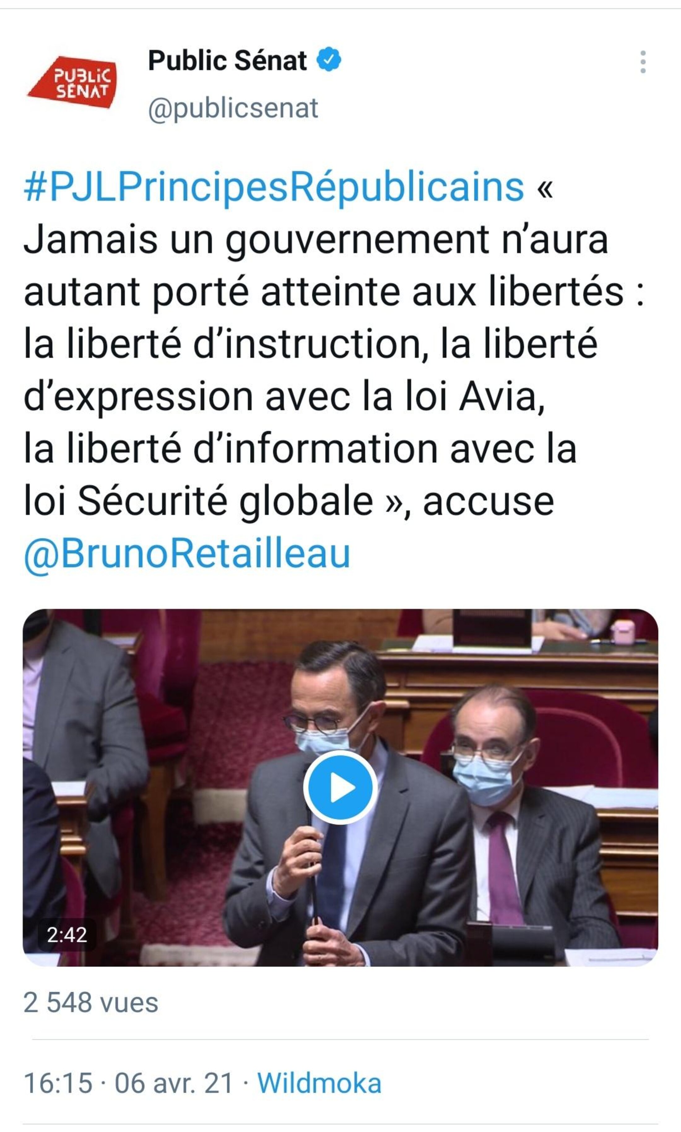 - le projet de loi annoncé le 2 octobre 2020 par le président de la République comme tendant à lutter contre le séparatisme (v. « Instruction en famille et séparatisme : une inconstitutionnalité en cache une autre ? », 9 décembre 2020) est devenu lors de son dépôt à l’Assemblée nationale le 9 décembre 2020 un texte « confortant le respect des principes de la République » ; il a été adopté en première lecture au Sénat le 12 avril par 208 voix contre 109, et les sénateurs ont à cette occasion ajouté le mot séparatisme à l'intitulé de la loi (loi « confortant le respect des principes de la République et de lutte contre le séparatisme » ) ;