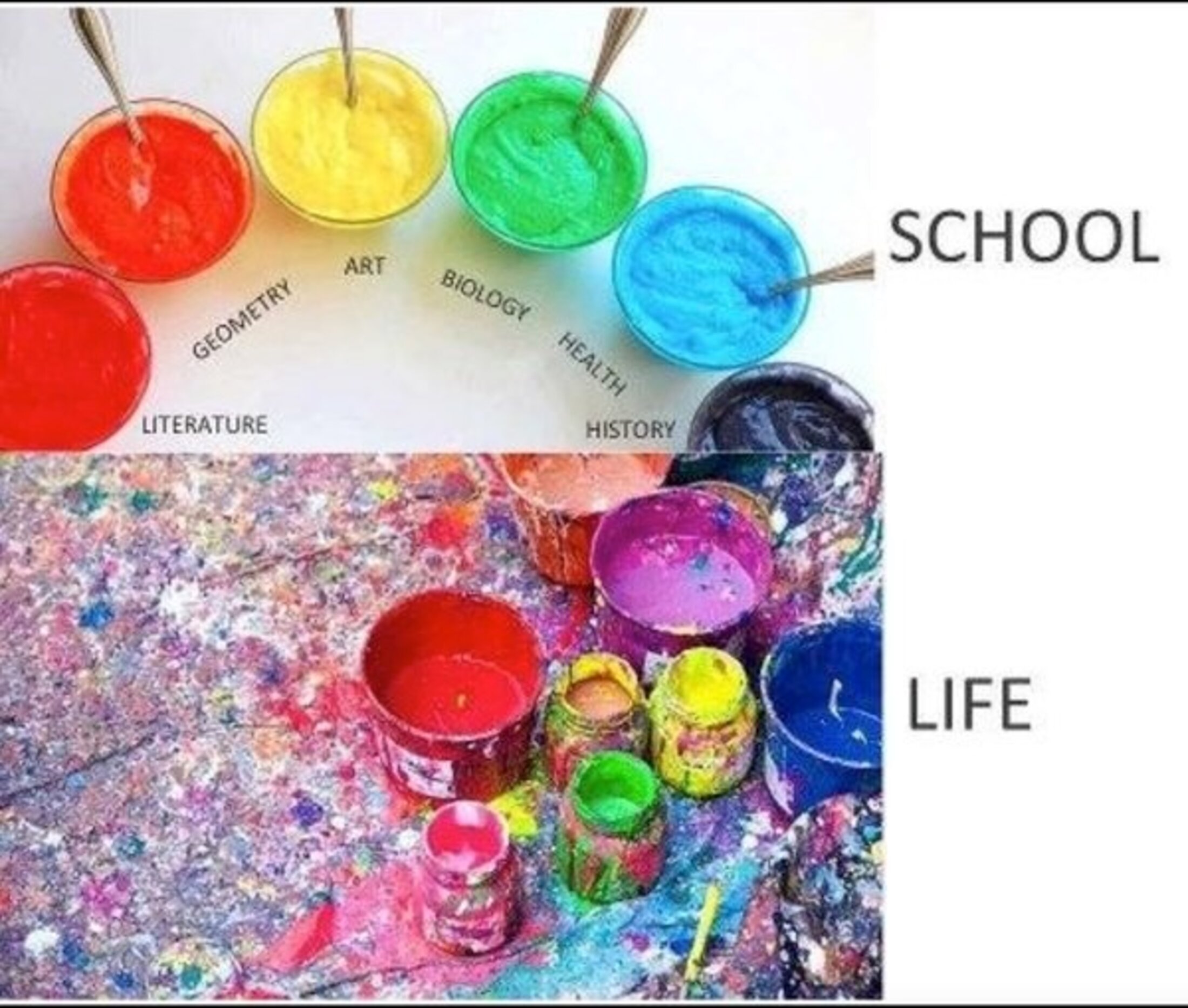 Voilà une image diffusée, depuis quelques jours, sur les réseaux sociaux pour dénoncer les écarts entre l’ordre scolaire des disciplines et la « vraie vie ». L’école y est représentée par une image d’ordre : tout est classé, rien ne se mélange, rien ne déborde. La vie au contraire éclate de mélanges, de débordements, de dégoulinures. La vraie vie, quoi!