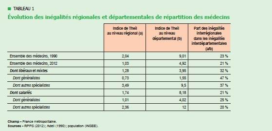 Les inégalités de répartition entre régions et entre départements sont plus marquées pour les médecins salariés que pour les médecins libéraux. En effet, les indices de Theil en 2012 pour les médecins libéraux sont beaucoup plus faibles que ceux des salariés (3,95 contre 8,18 au niveau départemental). Ce constat est l’inverse de celui observé pour les infirmiers et les sages- femmes, dont la répartition est plus inégalitaire pour les libéraux que pour les. De fait, les médecins libéraux sont majoritairement des médecins généralistes (à 54 %), qui font partie des services les mieux en adéquation avec les besoins la population, ce qui n’est pas le cas des autres spécialistes libéraux de premier recours (pédiatres, gynécologues, ophtalmologues).