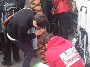 Anecdote : comme je quitte le rassemblement, un policier m'interpelle et me demande, probablement en fonction de l’État d'urgence, d'enlever l'autocollant que j'ai dans le dos. Ce qu'il fait gracieusement, à ma demande.