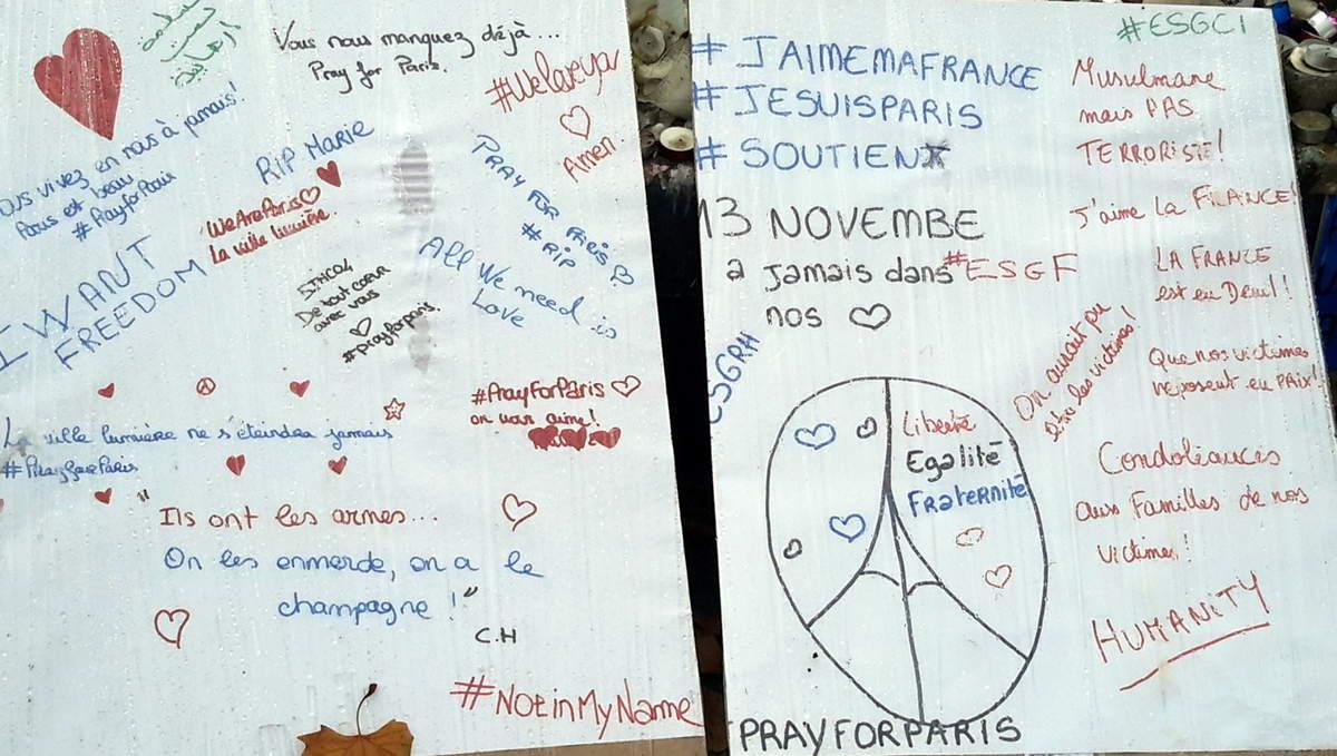 Paris a été touchée par une série d'attentats qui ont fait de nombreuses victimes. Au delà des manifestations, de nombreuses personnes ont voulu témoigner sur les lieux mêmes des attentats. Et surtout place de la République, à Paris. Par des images, par des textes...
