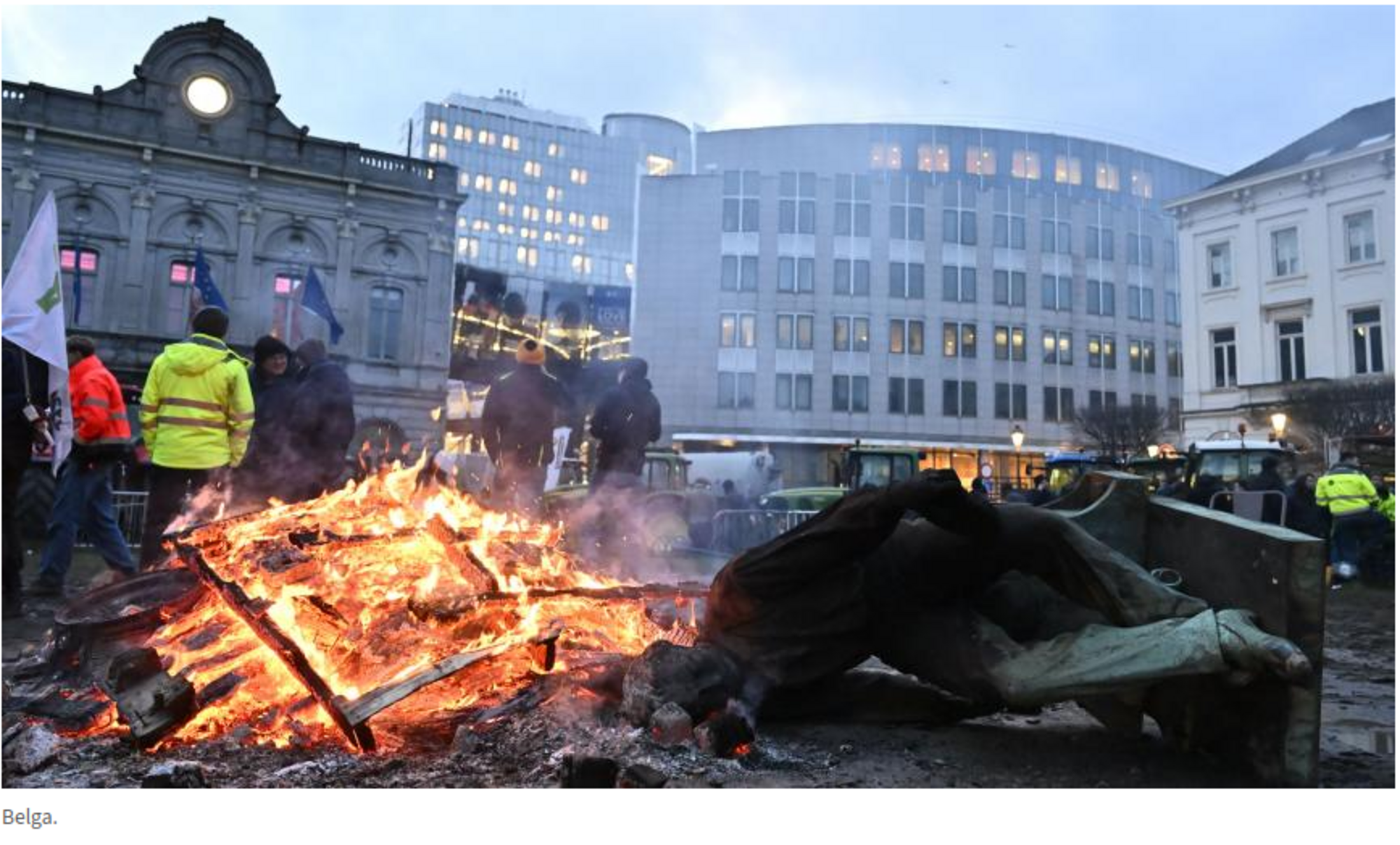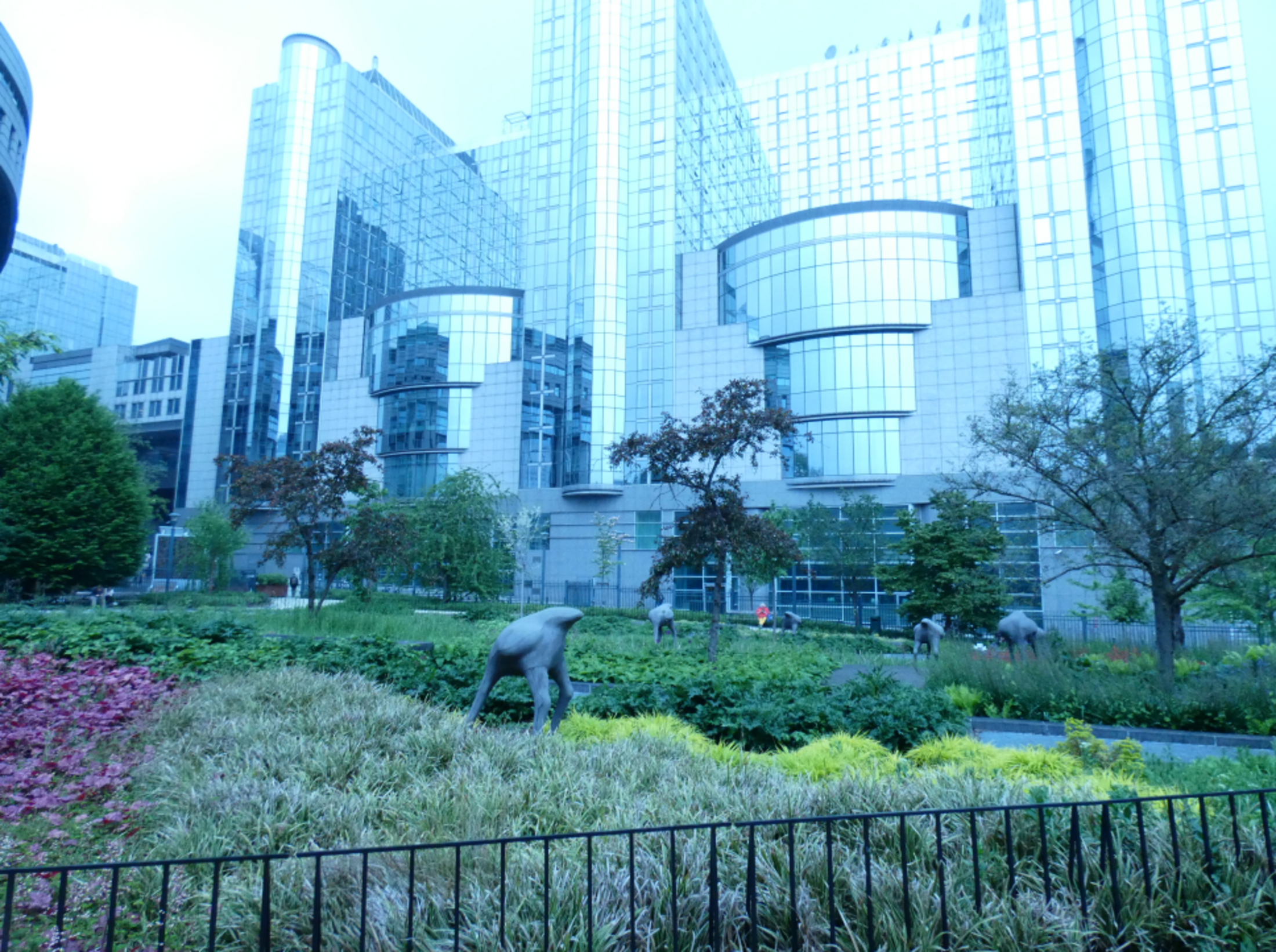 Pour être totalement complet, on peut prolonger l'alignement, même si la vue ne porte pas jusque-là tandis que l'esprit hésite d'autant plus à s'y aventurer qu'il doit franchir un tunnel où il pourrait bien se perdre définitivement, de l'autre côté de la façade du soit-disant Parlement : s'y côtoient en effet, une déesse Europe en fonte brandissant un grand « E » avec une légèreté barrosienne, et un arbre de la Liberté (des affaires) gracieusement offert au pseudo-parlement par la Fédération européenne des lobbyistes, auto-célébration d'une contribution démocratiquement essentielle « aux discours et aux votes » comme il est gravé dans le plexiglas, usurpation généreusement et logiquement acceptée par des députés qui n'en ont que le nom et en tous cas nul talent de bûcheron, y compris quand il ne s'agit point d'arbres mais d'amendements suggérés par les serviteurs des trusts. Cockerill, dont wikipedia nous apprend opportunément qu'« en 1838, malgré la faillite de son établissement bancaire, il fond(a) un complexe industriel indépendant comprenant les différentes fabriques destinées à développer le premier complexe industriel intégré » et la Déesse se répondent ainsi joliment par-delà les siècles, cette dernière ayant été inaugurée, parmi quelques autres œuvres de même facture, par ces saintes paroles : « Ces œuvres sont la concrétisation d'un accord particulier conclu entre les mondes de l'art, de la politique et de l'économie en vue de la réalisation en commun d'un projet profitable à tous. Celle-ci a été mise en œuvre grâce, notamment, à l'initiative d'entreprises privées soucieuses de s'affirmer comme sociétés européennes...une telle initiative ne s'intègre-t-elle pas dans les perspectives ambitieuses auxquelles nous convie l'Europe de 1992, à savoir l'expansion des entreprises et leur coopération à l'échelle communautaire, l'amélioration de l'environnement et l'aspiration à une société tournée vers l'homme et la culture ? »