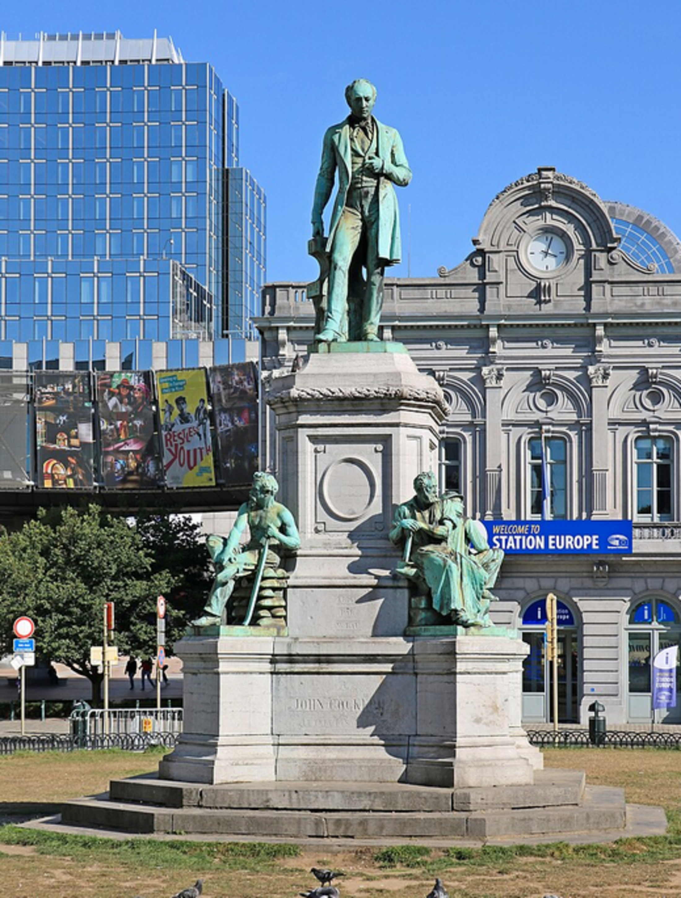 Dans l'alignement s'élève une statue de Cockerill, maître des Forges avec assis à ses pieds, à chaque coin : « un verrier, un puddleur, un houilleur et un mécanicien. » Les guides touristiques précisent que chacun portait le nom de son (ouvrier-) modèle en médaillon, ajoutant que cela les fit « entrer dans l'histoire » mais que pour ainsi dire, ils n'y auront fait qu'un petit tour, les dits-médaillons ayant disparu. Le monument est didactiquement intitulé « John Cockerill, père des ouvriers » et ces temps-derniers affublé d'un calicot : « Mittal, assassin ! » du meilleur effet ; comme quoi, il suffisait d'attendre que le passé se transforme en futur pour que l’œuvre fondue dans le paysage résonne de nouveau.