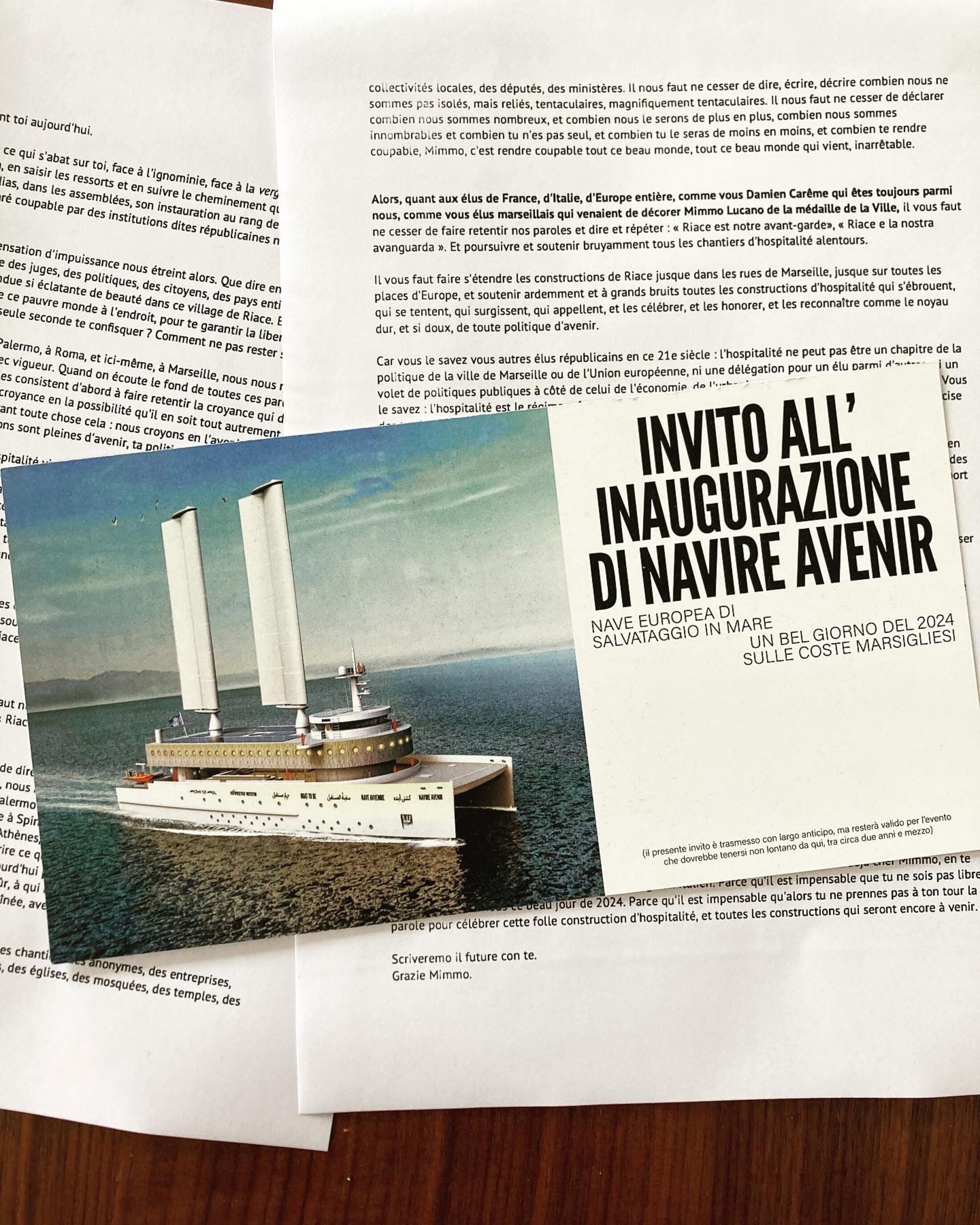 Pour l'inauguration du Navire Avenir, ici à Marseille, fin 2024, nous t'invitons d'ores et déjà cher Mimmo, en te remettant aujourd'hui ce carton d'invitation rédigé en Italien. Parce qu'il est impensable que tu ne sois pas libre et présent parmi nous ce beau jour de 2024. Parce qu'il est impensable qu'alors tu ne prennes pas à ton tour la parole pour célébrer cette folle construction d'hospitalité, et toutes les constructions qui seront encore à venir.