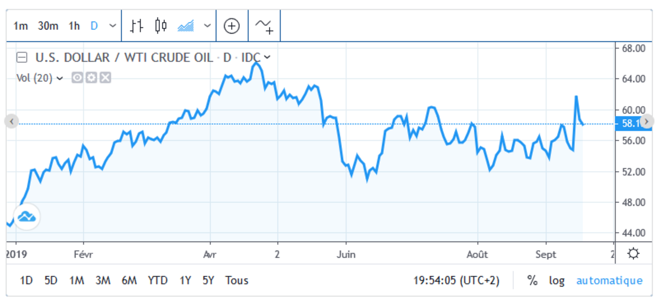 Figure 4 : Cotation du pétrole : WTI à New York depuis le début de 2019