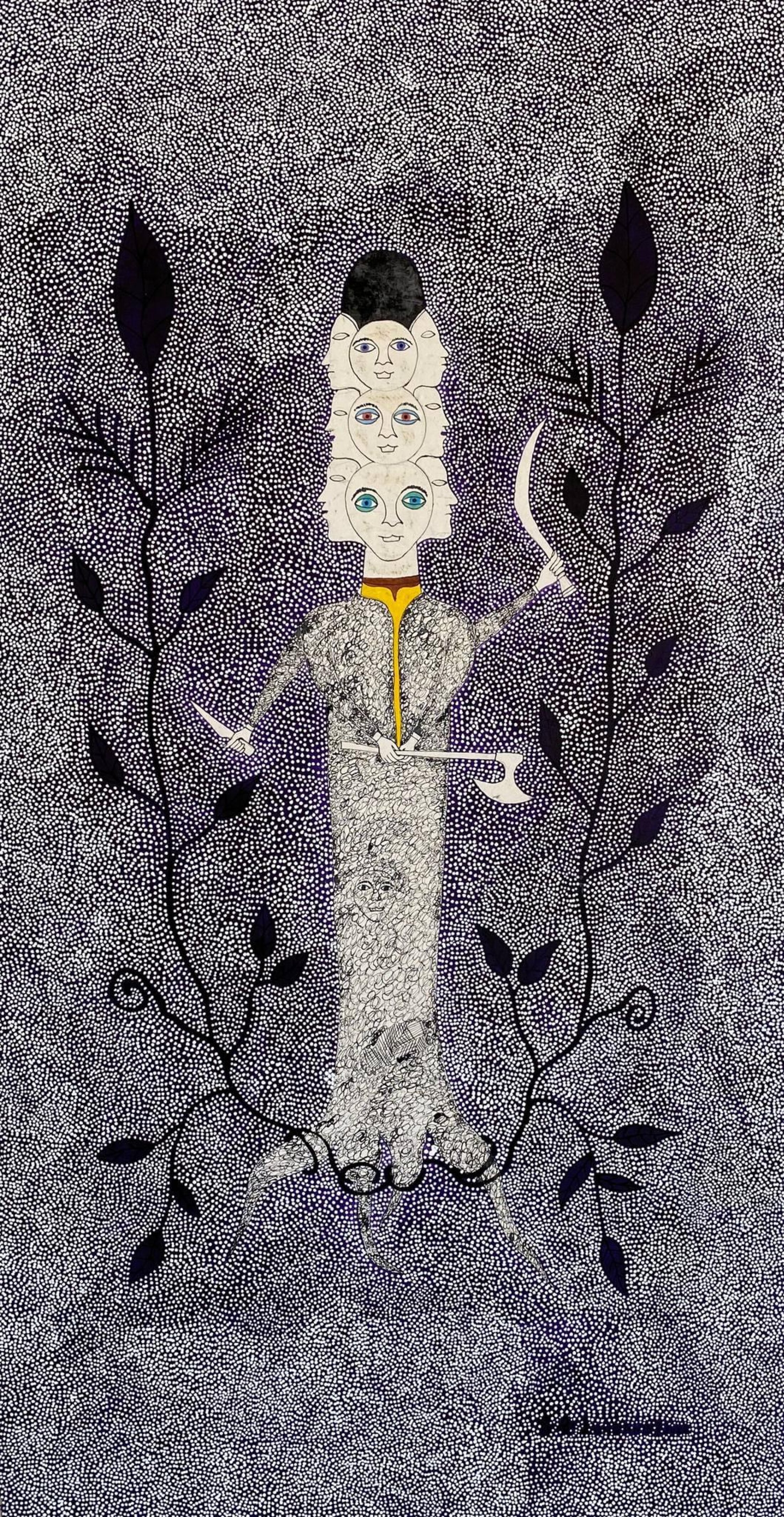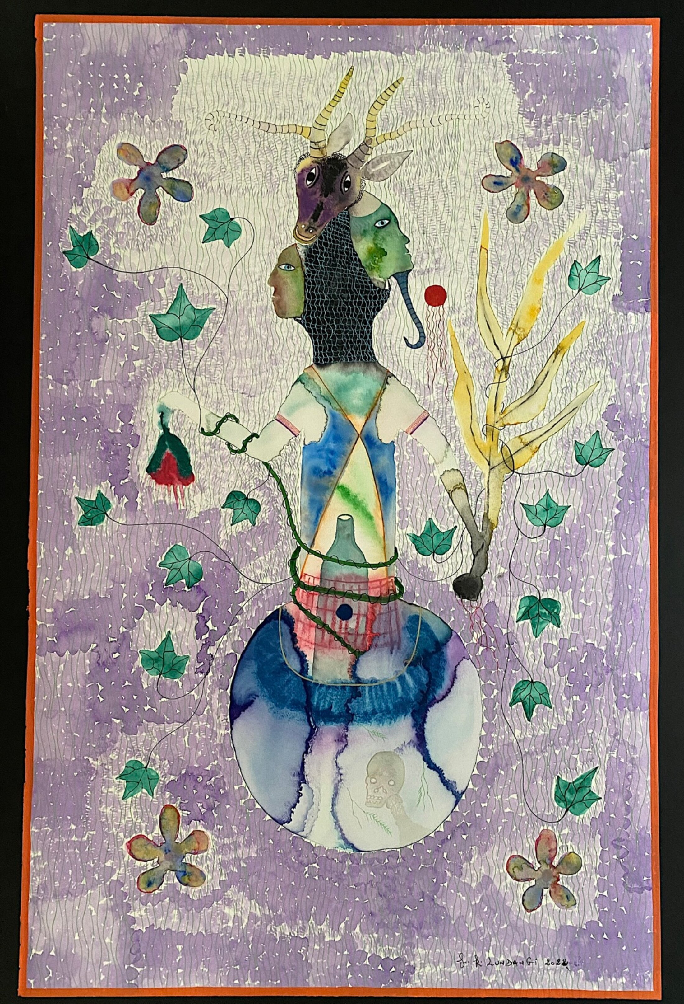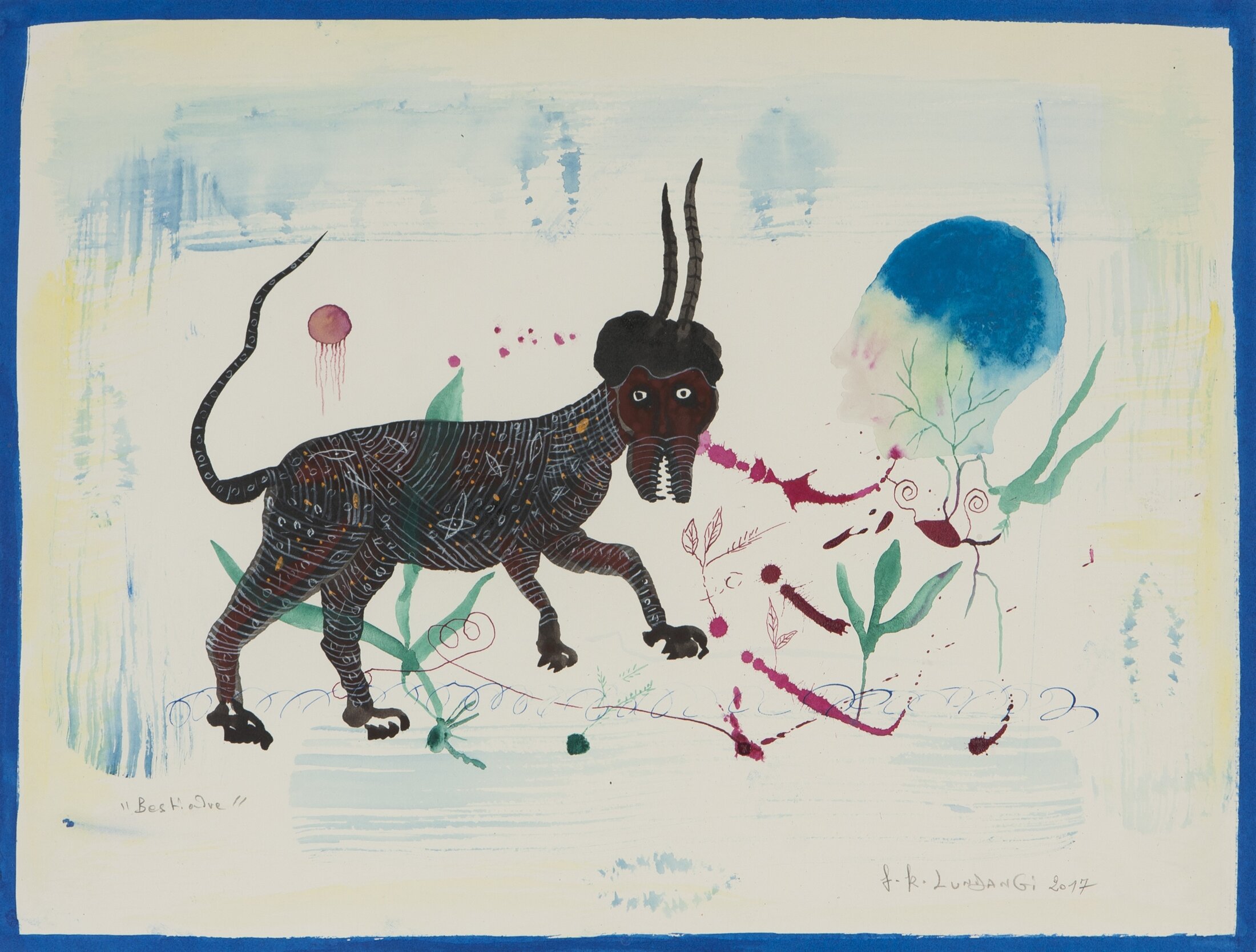 Avec la légèreté gracile de ses lignes aériennes, le dynamisme de son chromatisme, et le soin du détail, Franck Lundangi parvient à transporter ses figures dans une évanescence semblable à celle des images du rêve. Tels d’étranges phalènes surgissant depuis le fond des toiles, les créatures semblent flotter en se fondant dans la fluidité des aquarelles. Le peintre ne cache pas sa fascination pour le charme de la miniature persane à laquelle il emprunte toute l’élégance de son trait, la maîtrise du dessin et une liberté assumée à l’égard des règles de la perspective ou du souci de réalisme. Car loin de restreindre la puissance de l’imagination, comme le dit Bachelard, « Le minuscule, porte étroite s’il en est, ouvre un monde ». Et, quel monde ! De fait, l’artiste s’affranchit avec désinvolture de toutes les frontières culturelles, et va puiser dans un répertoire de motifs et de styles empruntant tout autant à sa tradition africaine, qu’aux cultures amérindienne, moghol, sikh ou eurasienne. L’artiste prend sans doute un malin plaisir à plonger notre regard dans un Babel de styles et de symboles en opérant une créolisation sans pareille d’influences qu’il s’approprie avec une évidente aisance. Il semble ainsi mixer une aquarelle améthyste dont le fond en pointillé rappelle le travail des artistes aborigènes avec les lignes raffinées de l’iconographie moghole ou sikh.