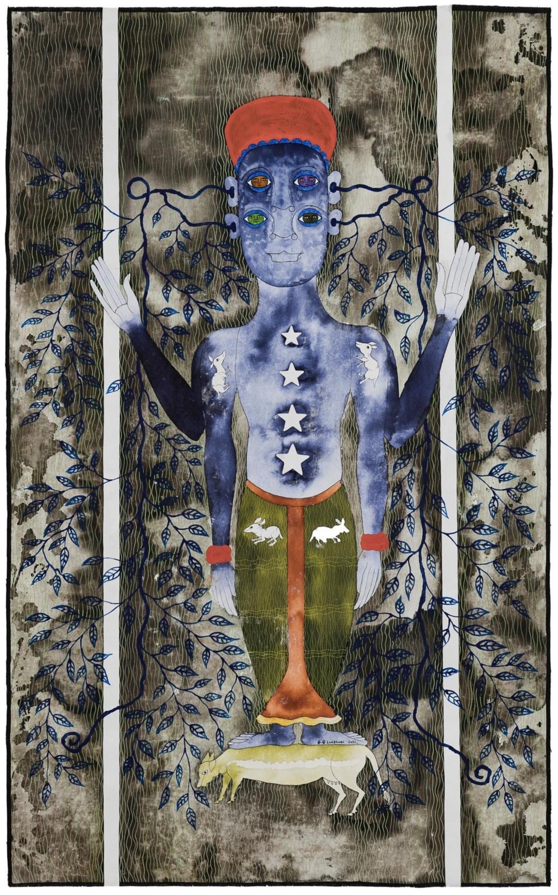 La plupart des peintures de Franck Lundangi s’organisent autour d’une figure centrale évoquant tout autant les formes totémiques d’un être hybride, humain et zoomorphe, divin et végétal, que celles de divinités païennes dont le hiératisme n’est pas sans suggérer, parfois, la sérénité d’une déesse indienne ou l’indifférence d’un bouddha aux folies de ce monde. Malgré, la variété de ces personnages peints de manière frontale sur de grands aplats de couleur, ornés de lierres, de feuillages et de fleurs exotiques, toutes ces figures inspirent l’immobilité contemplative qui sied à l’harmonie intérieure. Ne sont-elles pas d’ailleurs fréquemment affublées d’un troisième œil dont la tradition mystique attribue un pouvoir de vision supérieure ? Tout dans cet art conspire à la méditation, et invite le spectateur à un recueillement profond dont l’expérience quotidienne nous éloigne si souvent avec son flot incessant d’images, de sons, et d’informations effrénées. Chaque peinture ne joue-t-elle pas le rôle d’une sorte de mandala où le regard semble attiré en son centre ?