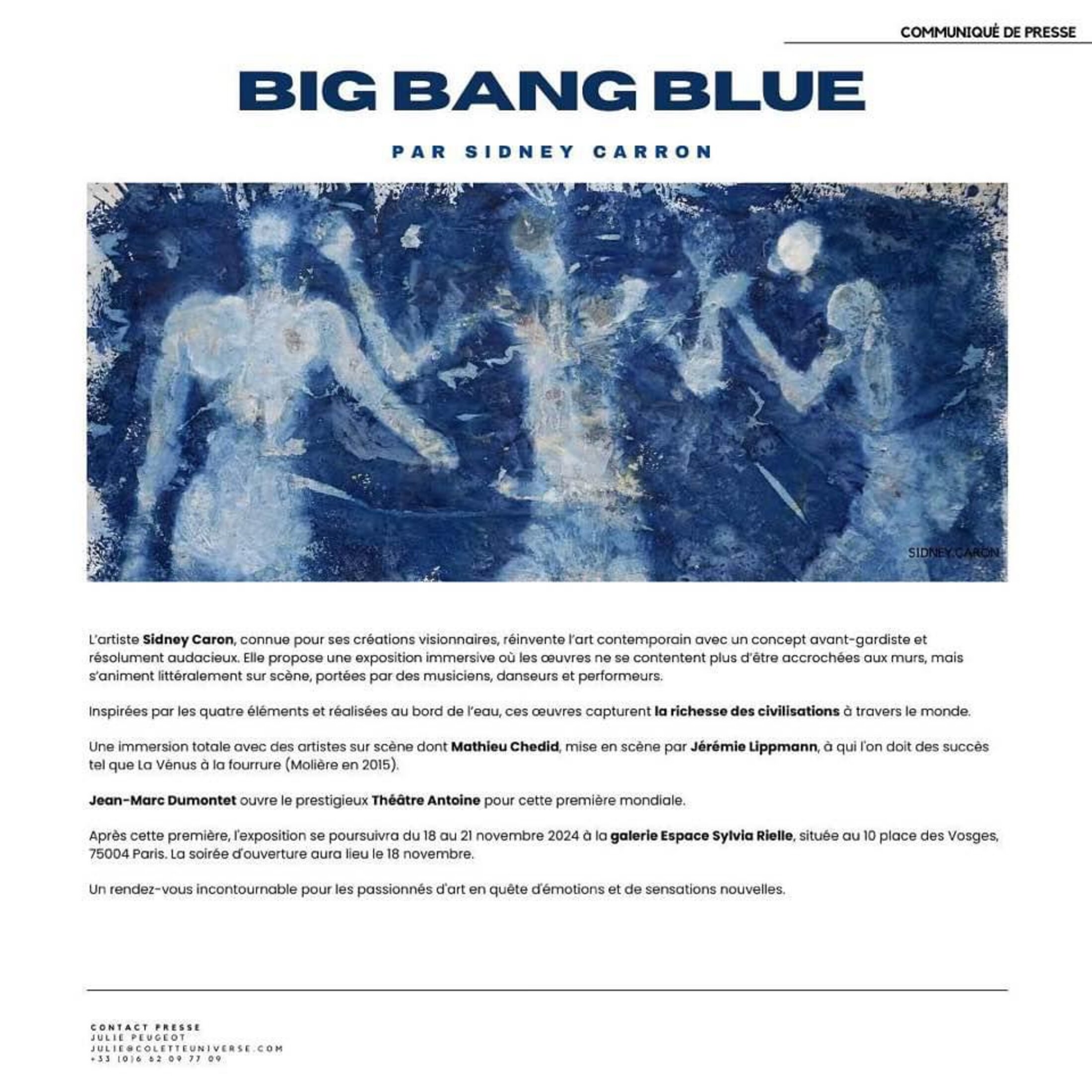 Sidney Carron présentera sa nouvelle collection d’oeuvres lors d’un show autour de son travail au théâtre Antoine le 14 octobre 2024, issus d’une longue recherche alchimique et chimique , elle a travaillé avec tous les éléments de la nature, au Costa Rica, au Bresil, au Senegal, au Portugal, dans le sud de la France, où elle a rencontré les natifs, les peuples, les touristes, et créé ces oeuvres monochromes singulières.