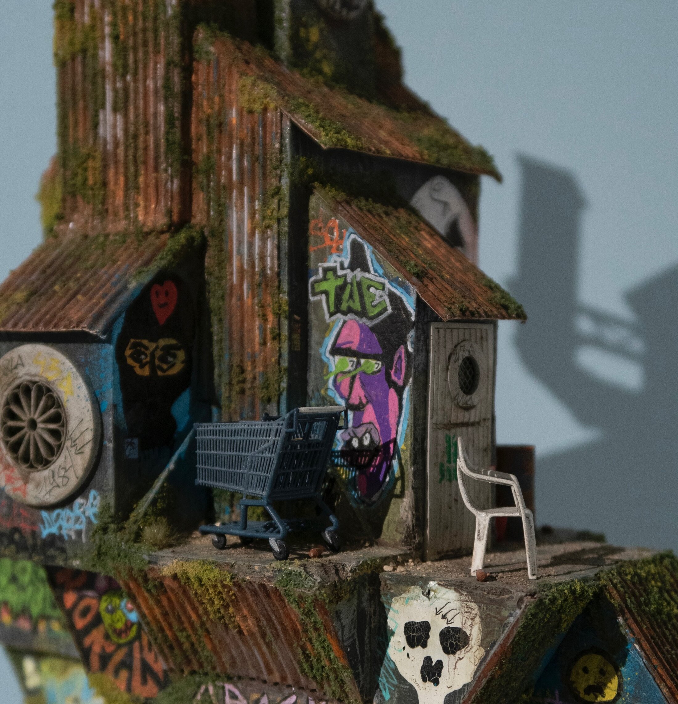 En découvrant les œuvres de Simon Laveuve, on serait tenté de repenser à la boutade de Dubuffet, selon laquelle l’art « est toujours là où on ne l'attend pas ». Après des décennies d’un art contemporain affichant le caractère ostentatoire de ses créations monumentales dans des lieux d’art édifiés à la (dé)mesure de leurs cadres toujours plus imposants, nous assistons à l’émergence d’une nouvelle tendance esthétique qui prend à rebours cette quête de gigantisme, en prônant les vertus de la miniature, le goût du minuscule, l’attention au détail, et la rêverie des espaces intimes. Simon Laveuve est certainement à la pointe de ce désir de retrouver une échelle plus humaine de la création, fut-elle au 1/35ème, dans une proximité renouant avec l’émerveillement de l’enfance. Concrètement, l’artiste né en 1988, en banlieue parisienne confectionne des sculptures miniatures d’architectures chimériques. Guérites parcourues de graffitis anciens, cabane de guingois, tourelles envahies de végétation touffue, phares bardés de couleurs trash, navires en lévitation improbable, plates-formes délabrées, bouées, et radeaux aux formes lilliputiennes…les sculptures-maquettes de Simon Laveuve déclinent un inventaire quasi surréaliste d’habitats improbables, qui n’ont rien à envier aux folies architecturales d’un Richard Greaves ou celles du Palais du Facteur Cheval.