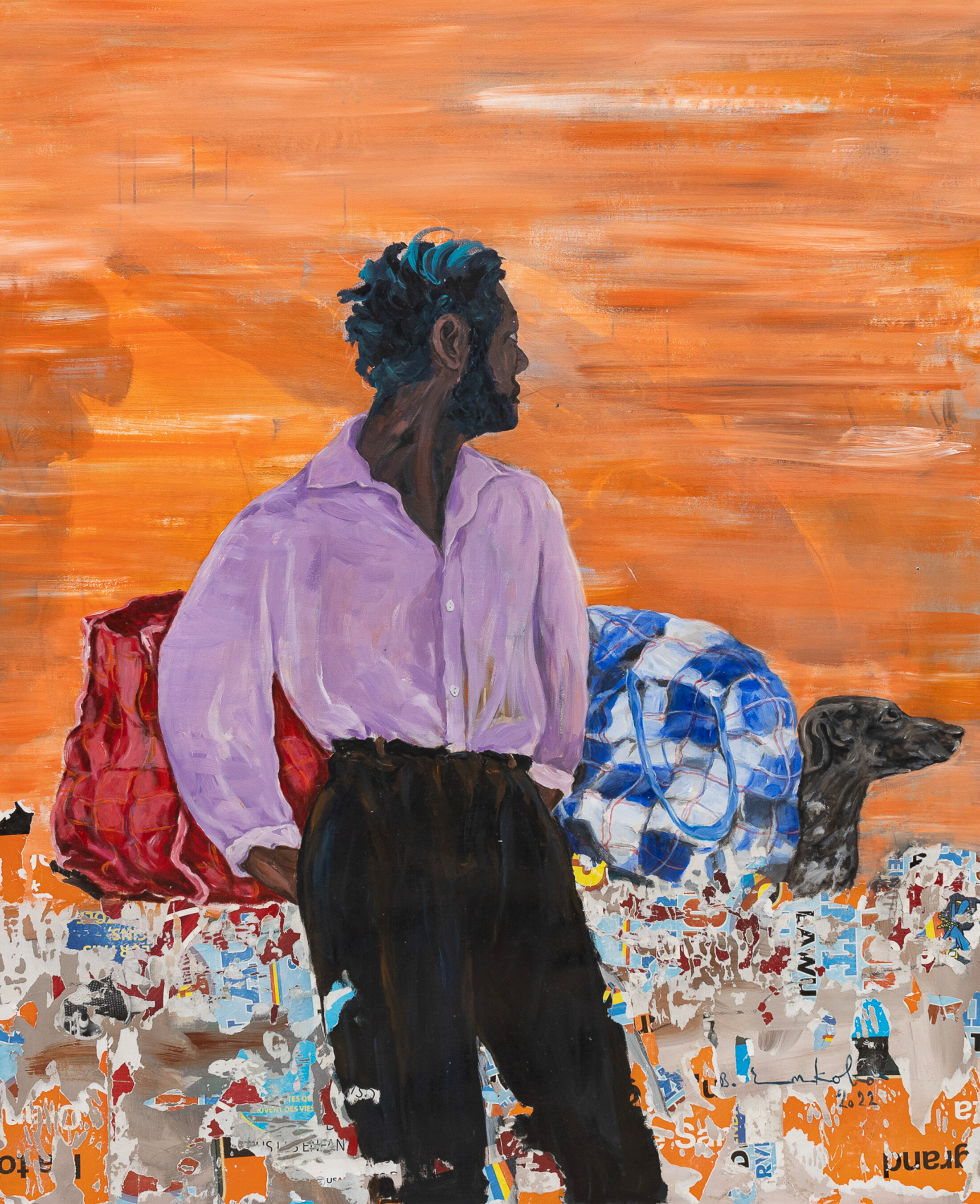L’omniprésence du sac de voyage ne témoigne-t-elle pas de cette condition aussi cruelle qu’absurde de ces peuples toujours sommés de quitter leurs traditions et leur terre, à l’image de ces migrants emportés par les eaux de la méditerranée en quête d’un eldorado illusoire ? N’est-ce pas là le secret du regard mélancolique de cet homme en partance pour un exil incertain, magnifiquement saisi dans la toile Mboka Mosika (Loin de mon pays), que de manifester l’écart entre l’immensité de ses rêves et le peu de moyens de les satisfaire ? Se souvient-il, peut-être, comme l’écrivait Aimé Césaire, de ces « millions d'hommes à qui on a inculqué savamment la peur, le complexe d'infériorité, le tremblement, l'agenouillement, le désespoir, le larbinisme » ?
