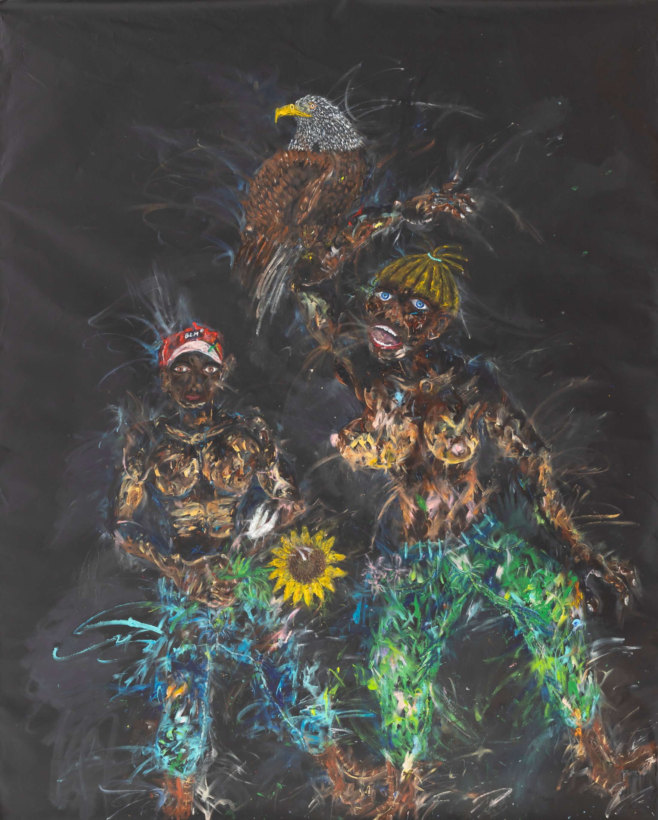 Ce rapace à la vue redoutable, n’incarne-t-il pas la figure d’un totem bienveillant pour le peintre dont l’art de la vision consiste à scruter le réel par-delà les ténèbres ? N’est-il pas également cet oiseau de paradis prenant sous ses ailes mordorés les rescapés du génocide Lari au Congo, dont l’artiste se fait le témoin dans plusieurs de ses toiles ?