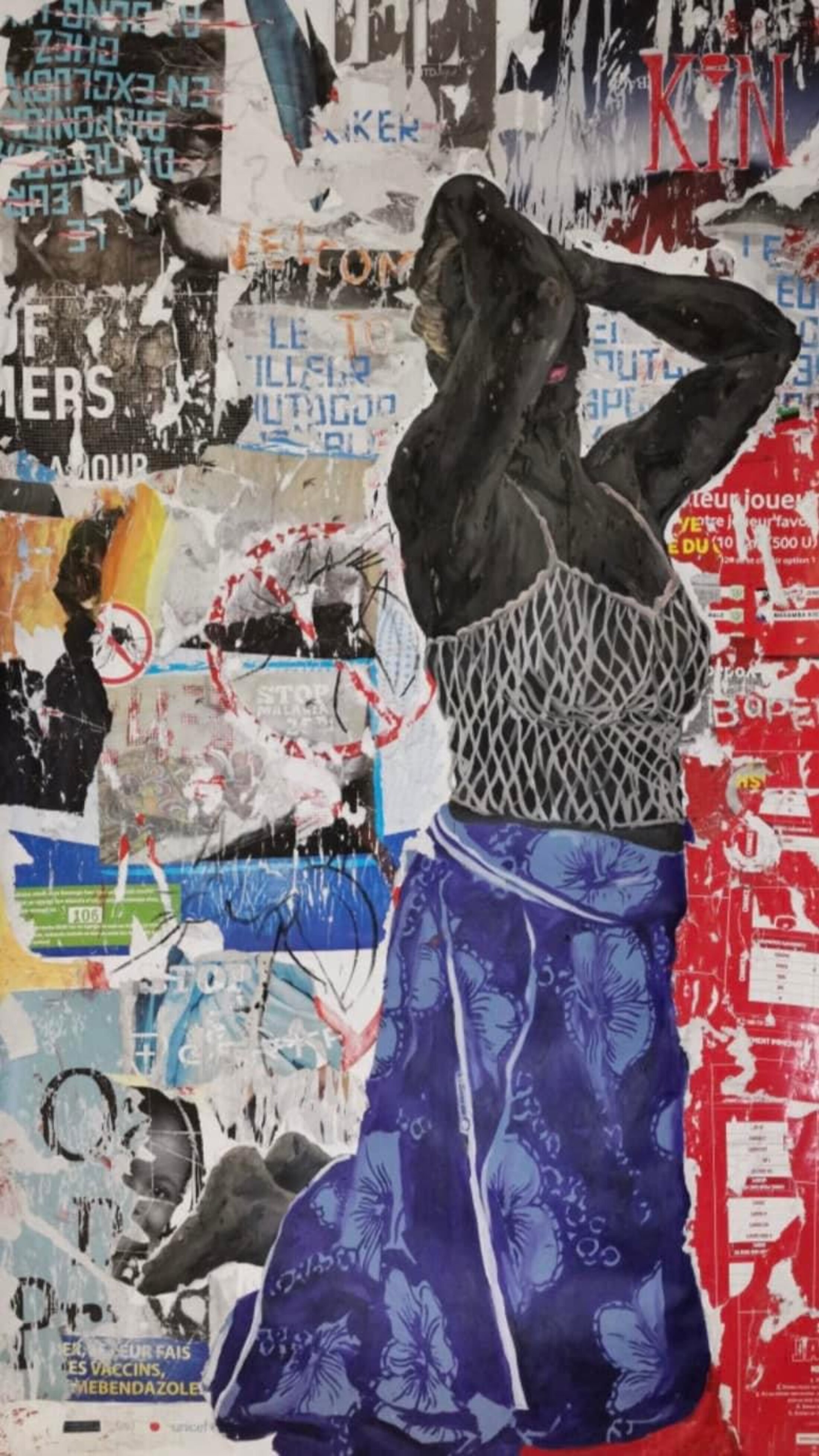 Si Bouvy Enkobo développe un art du portrait de facture réaliste dans sa figuration apprise aux beaux-arts de Kinshasa, il élabore, en revanche, l’arrière-plan de ses motifs avec une jubilation toute expressionniste, se jouant de l’écart entre une peinture figurative explicite et un travail plastique de décomposition des fonds, conférant à ses toiles les allures des affiches déchirées de Villeglé ou de Hains. Cette technique très personnelle mêlant collage et acrylique, permet à l’artiste d’intensifier la présence de ses personnages qui semblent ainsi flotter en se détachant étrangement de ces fonds tumultueux aux couleurs chamarrées. Pour cela le peintre se fait colporteur d’affiches commerciales, électorales, ou de journaux remplis de graffitis, qu’il récupère principalement à Kinshasa, afin d’accompagner ses toiles d’une sorte de bande son urbaine leur impulsant une tonalité rythmique étonnante.
