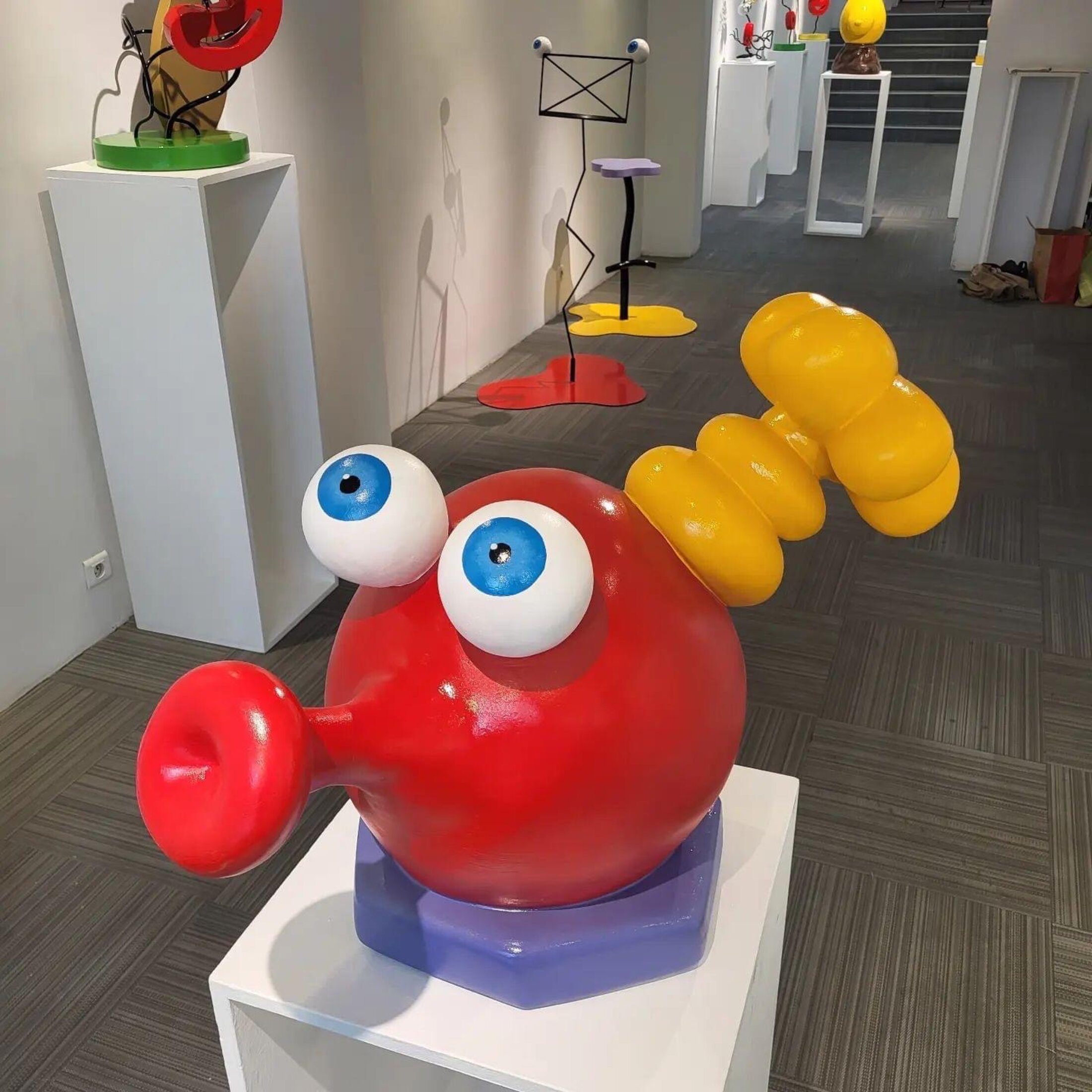 Qu’elle soit faite en résine moulée d’après un modelage en terre, en bronze, en métal peint laqué, en pierre taillée ou en assemblage d’éléments soudés, la sculpture de Richard Di Rosa prend forme à partir de divers matériaux, pour arriver à cette présence statuaire ramassée, centrée autour d’un point de gravité pour trouver l’équilibre parfait. Une rythmique d’enfer, et des protocoles de travail toujours multiples. Ici pas de procédé, pas de répétition ad libitum comme chez Orlinski où « l’on choisit la taille et la couleur. Mdr ! »