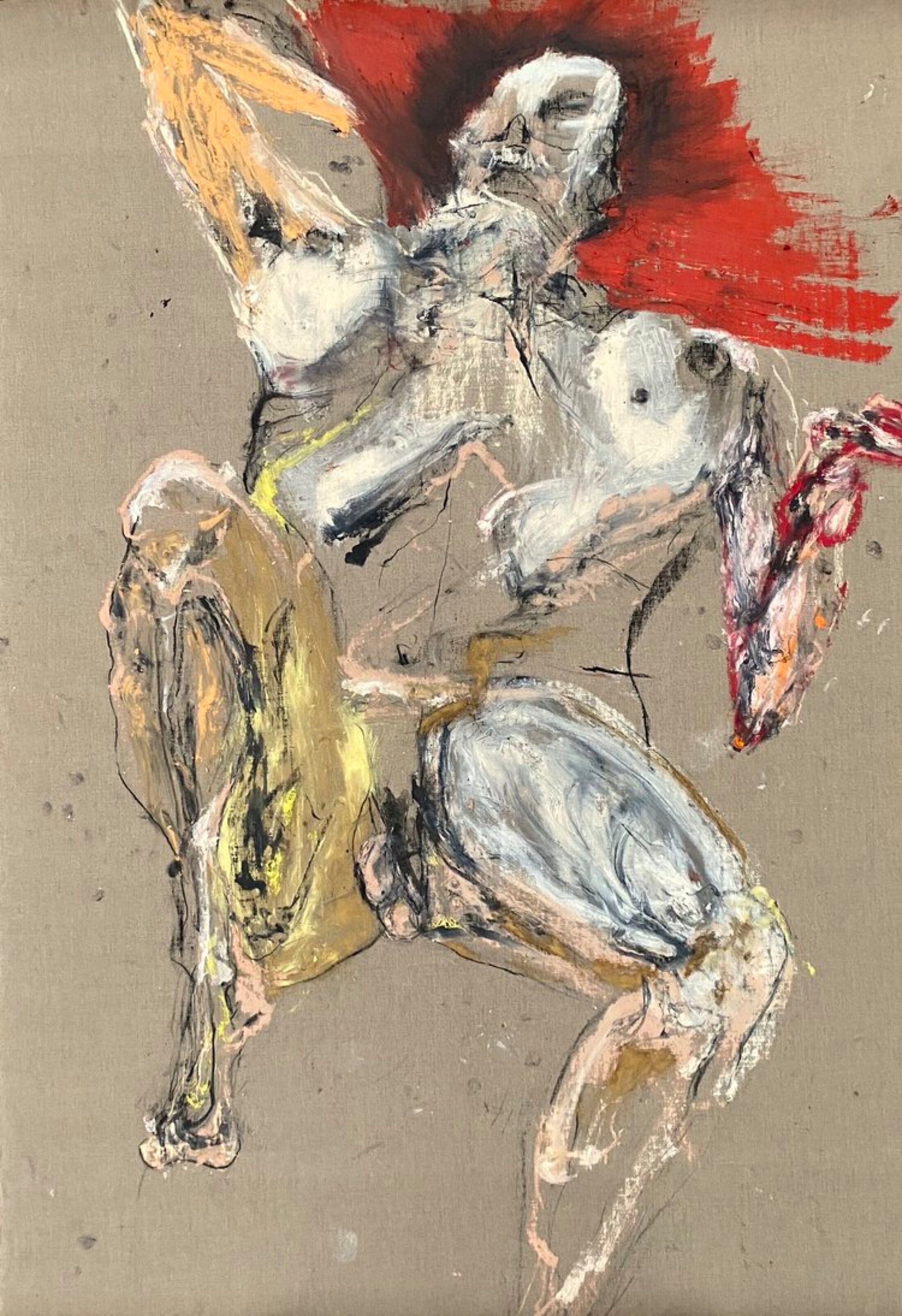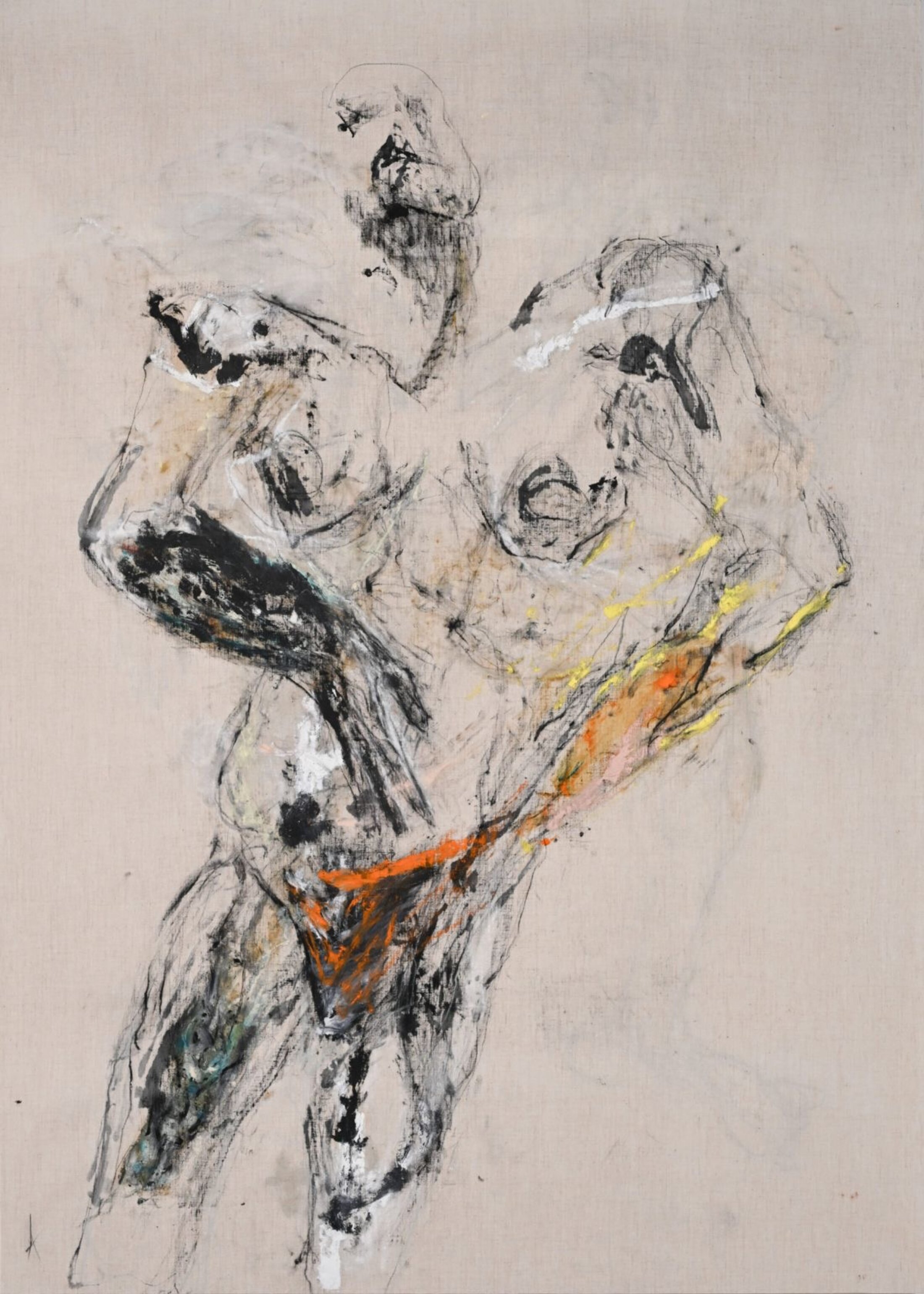 En concentrant l’essentiel de son art sur la pratique du dessin et sur le seul motif du nu, Arghaël renoue avec cette longue histoire de la représentation des corps qui va de la préhistoire avec la Vénus de Willendorf, en passant par l’idéal de perfection antique avec la statuaire Praxitèle au culte de la chair magnifiée chez Renoir ou celle exacerbée des peintures de Lucien Freud. L’artiste cherche sans doute à ancrer son art dans un sol suffisamment consistant pour supporter les cadences et les danses dont son œuvre est porteuse. Chacune des figures dessinées ne semble-t-elle pas emportée dans une sorte de vertige d’autant plus intense qu’elle conjure toute reconnaissance visuelle des attributs par lesquels on identifie habituellement les êtres ? Les visages ne sont-ils pas systématiquement biffés à la manière de certains autoportraits d’Artaud ?
