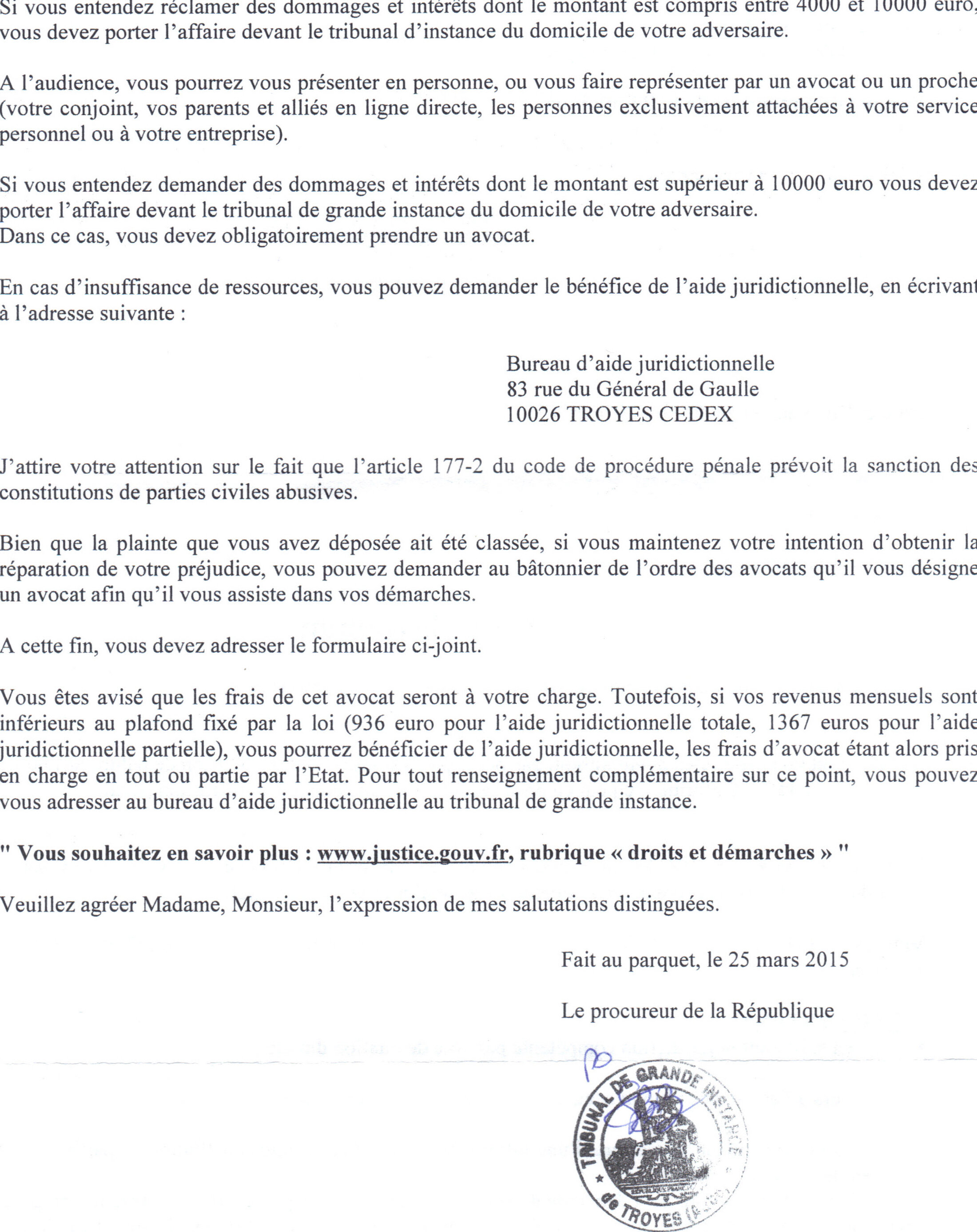 Le 25 octobre 2015, j'ai reçu l'avis de classement daté du 25 mars de ma plainte déposée le 25 février contre Alex PERRIN. Requérir de non-informer (pour un motif FAUX) ne peut en droit recevoir une quelconque qualification pénale...