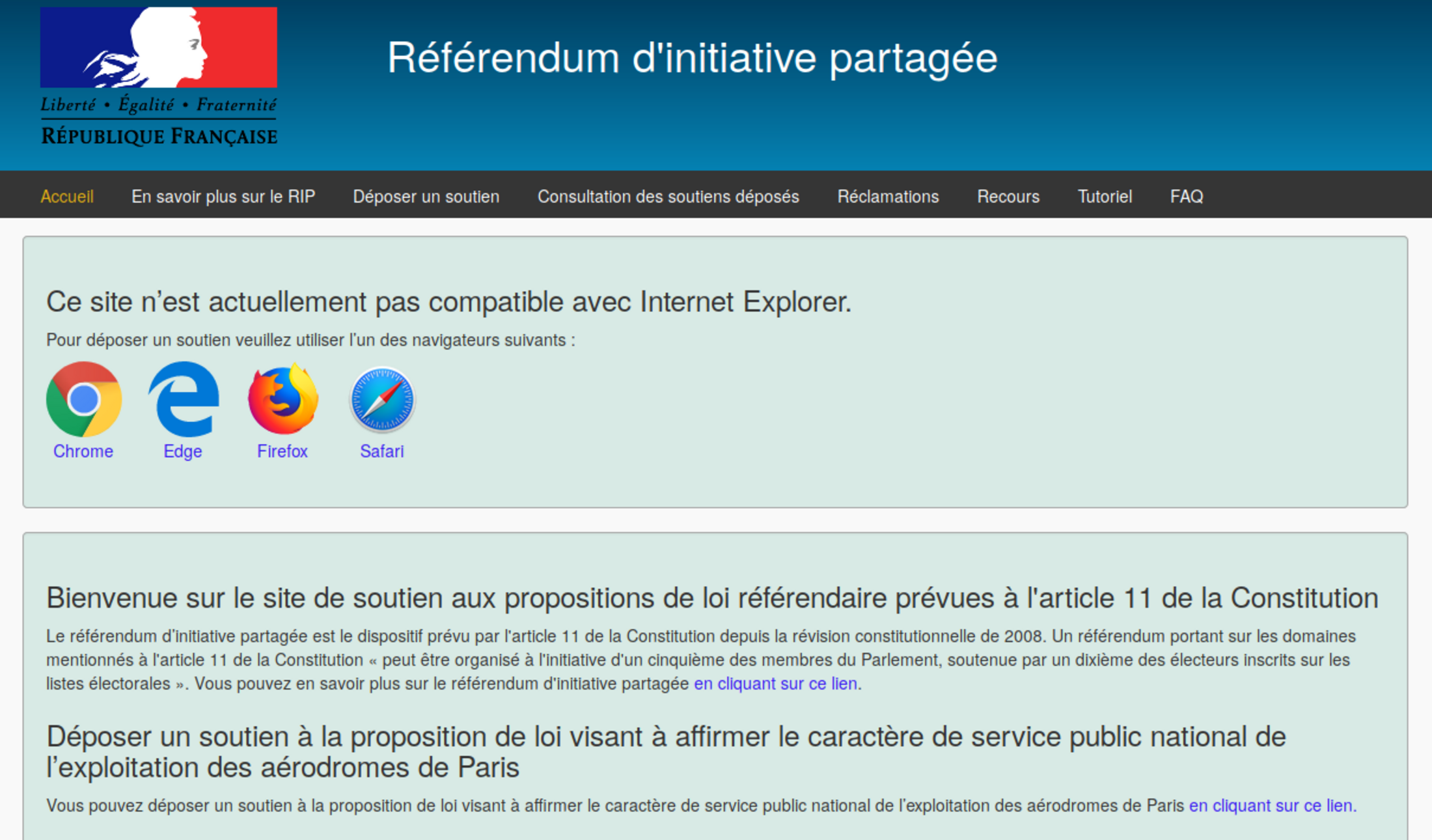 C'est un bandeau qui apparaît en premier sur la page d'accueil du site du ministère de l'intérieur dédié au Référendum d'Initiative Partagée : "Ce site n’est actuellement pas compatible avec Internet Explorer". Suivent les logos de quatre navigateurs internet qui sont compatibles avec le site.
