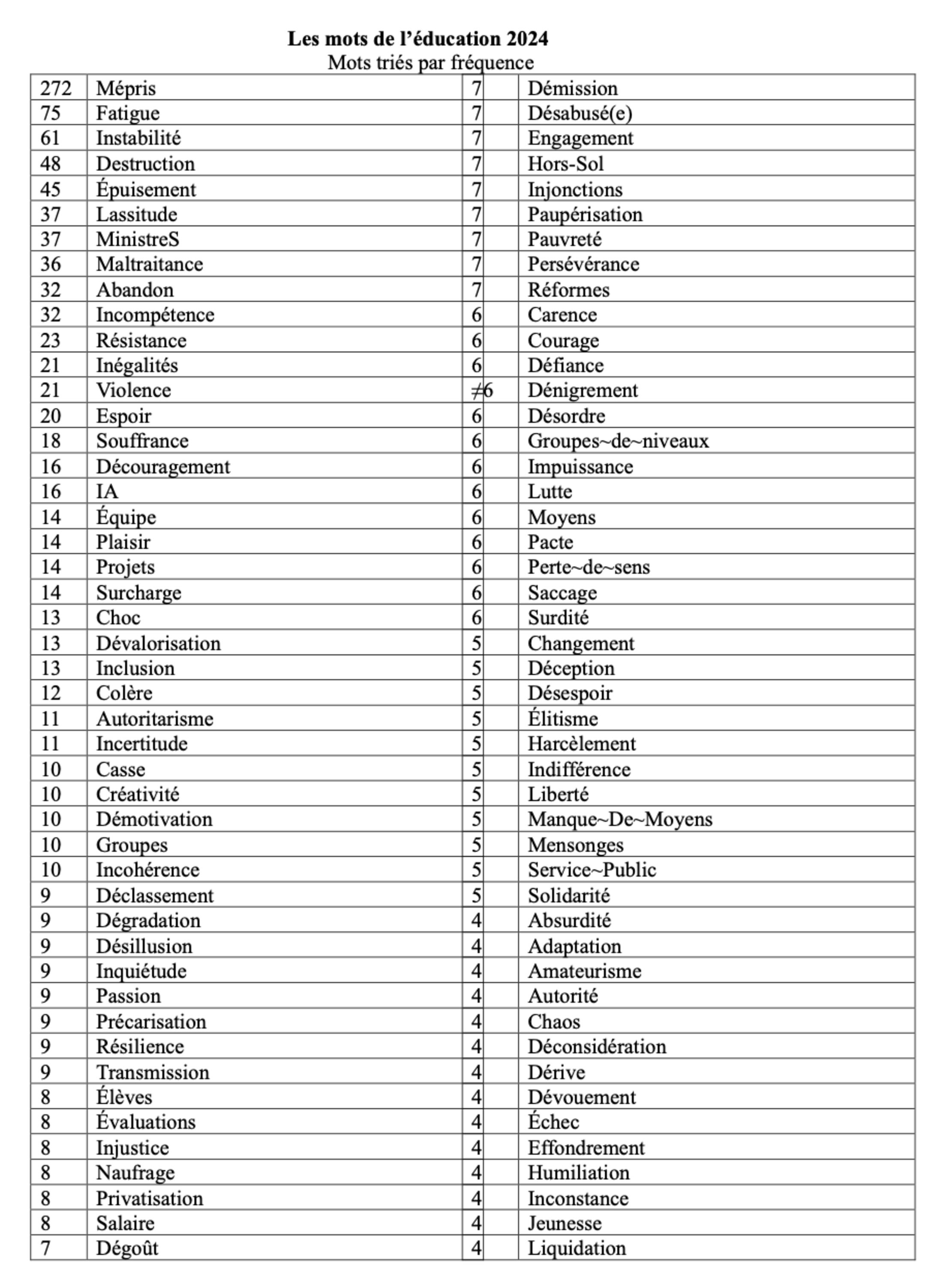 Le choix de trois mots est évidemment réducteur et interdit la nuance. J'aurais pu « orienter » les réponses en demandant trois mots positifs et trois mots négatifs... Mais on me l'aurait reproché et cela n’aurait pas permis, à mon sens, de saisir justement le « moral » des enseignants.