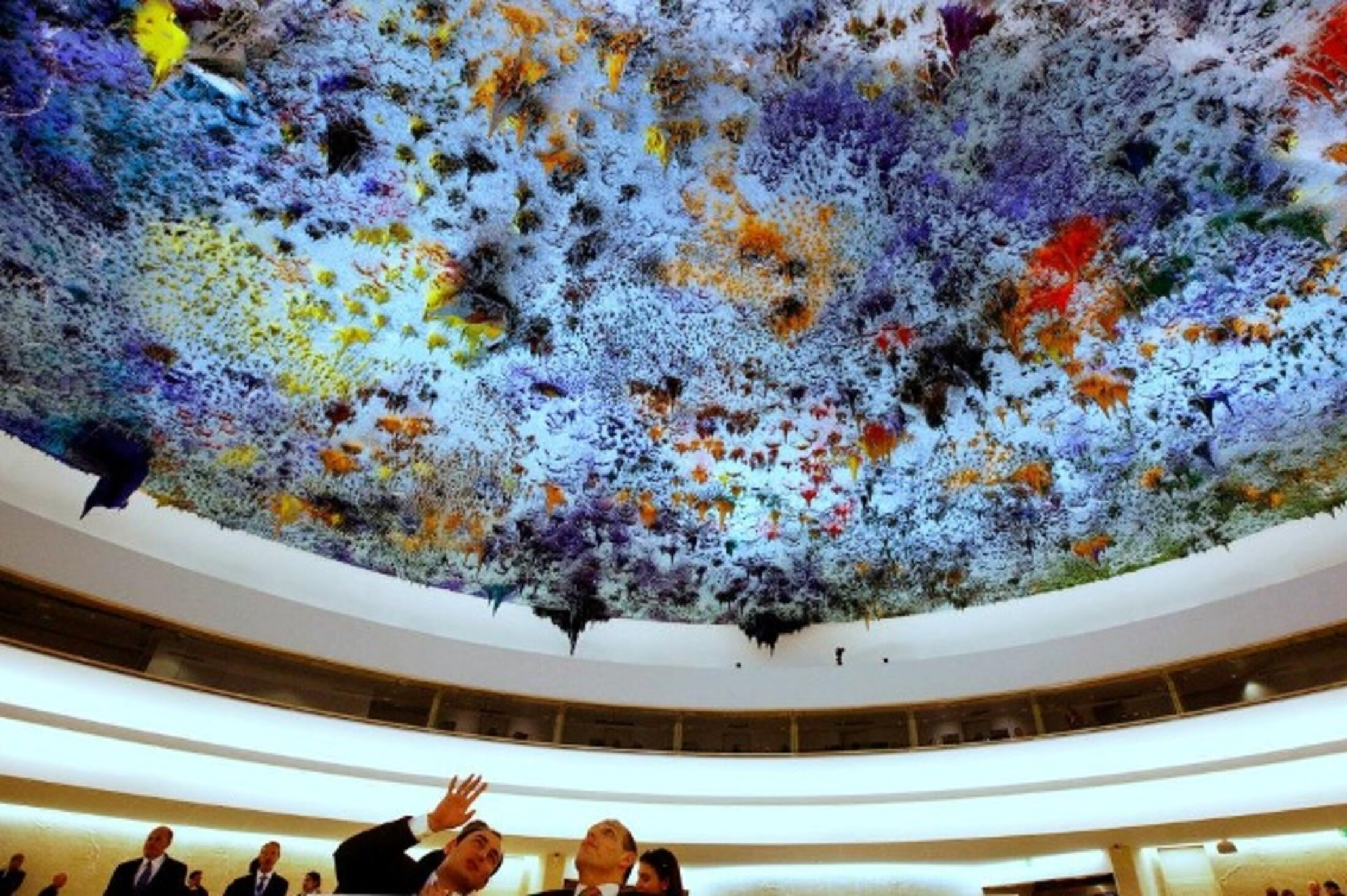 J’ai entendu, ce matin même, une phrase très étonnante, dans la salle où se réunit le Conseil des Droits de l’Homme de l’ONU, à Genève. La guide, une personne passionnante qui parle au moins cinq langues mais ne travaille qu’en temps partiel comme guide touristique du palais des Nations-Unies à Genève, expliquait le plafond. Il s’agit d’une oeuvre d’un artiste espagnol où des stalactites de plâtre semblent figés dans une myriade de couleurs. L’idée derrière cette oeuvre étant que selon la place dans la salle, on ne voit pas les même couleurs dominer. Ici, la perspective mettra l’accent sur le violet, là sur le rouge, au contraire sur le vert de l’autre côté, etc. Le plafonnier doit rappeler qu’il n’existe pas une seule vision des droits de l’homme, et que tous doivent se recroiser pour rechercher le meilleur mélange possible. Bien.