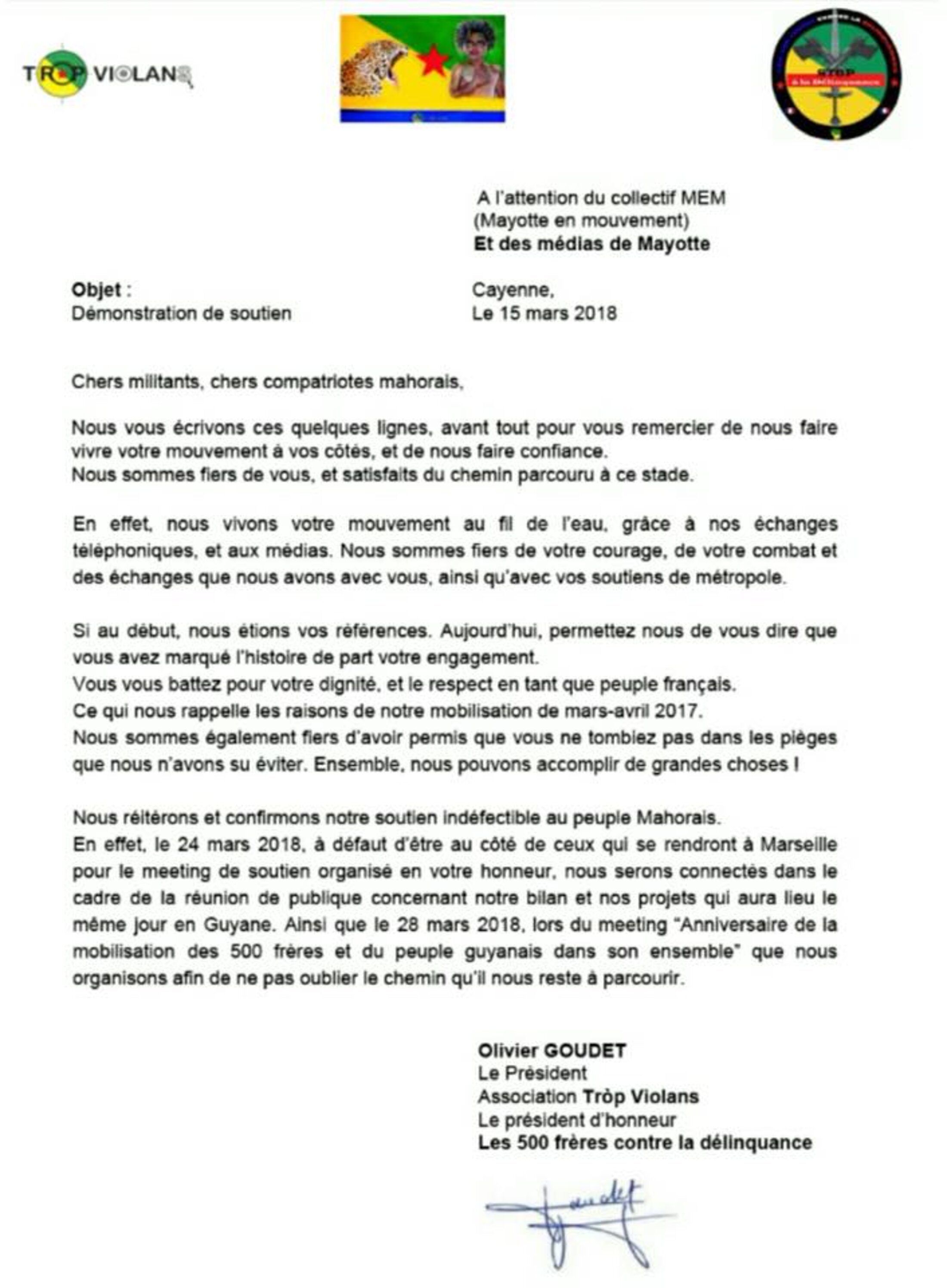 Aujourd'hui, M. Olivier Goudet, le Président de l'Association Tròp Violans et président d'honneur de l'association Les 500 frères contre la délinquance [En Guyane], adresse son soutien au "Peuple Mahorais" (sic) à l'attention des médias de Mayotte via le collectif Mayotte en Mouvement (MEM). Voir la Démonstration de soutien en objet de la lettre ci-dessous.