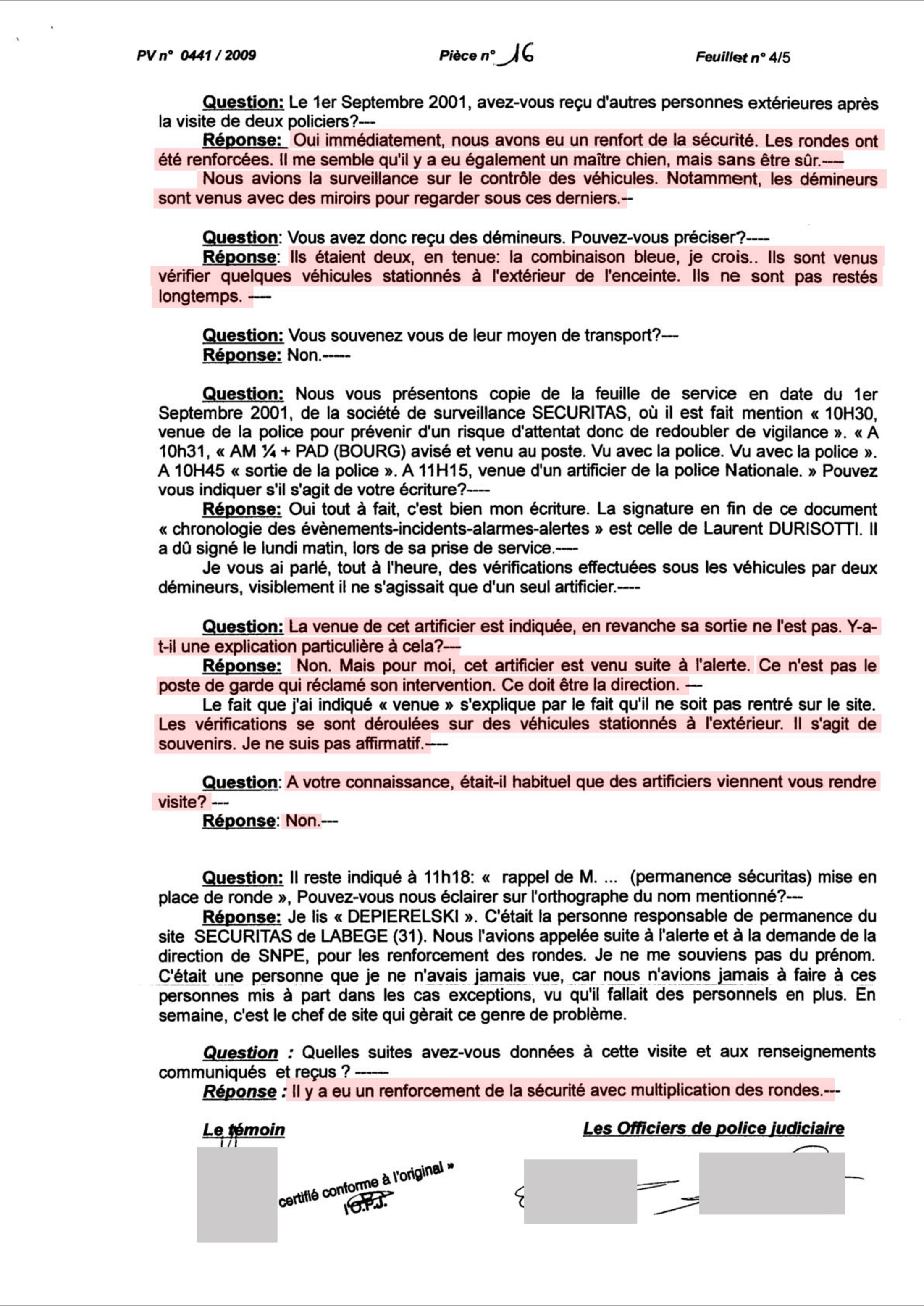 Apparemment les deux artificiers de 11h15, le 1er septembre 2001, ont été trouvés et interrogés en 2009, il s’agit de messieurs Frédéric Ader et Alain Puech. Basés à Colomiers, ils dépendaient tous les deux de la Police Nationale, mais ils n’étaient pas au courant de la venue des deux policiers moins d’une heure avant ! Tous deux confirment l'existence d'une note de service motivant leur venue et que le risque d'attentat était bien l'objet de cette note !