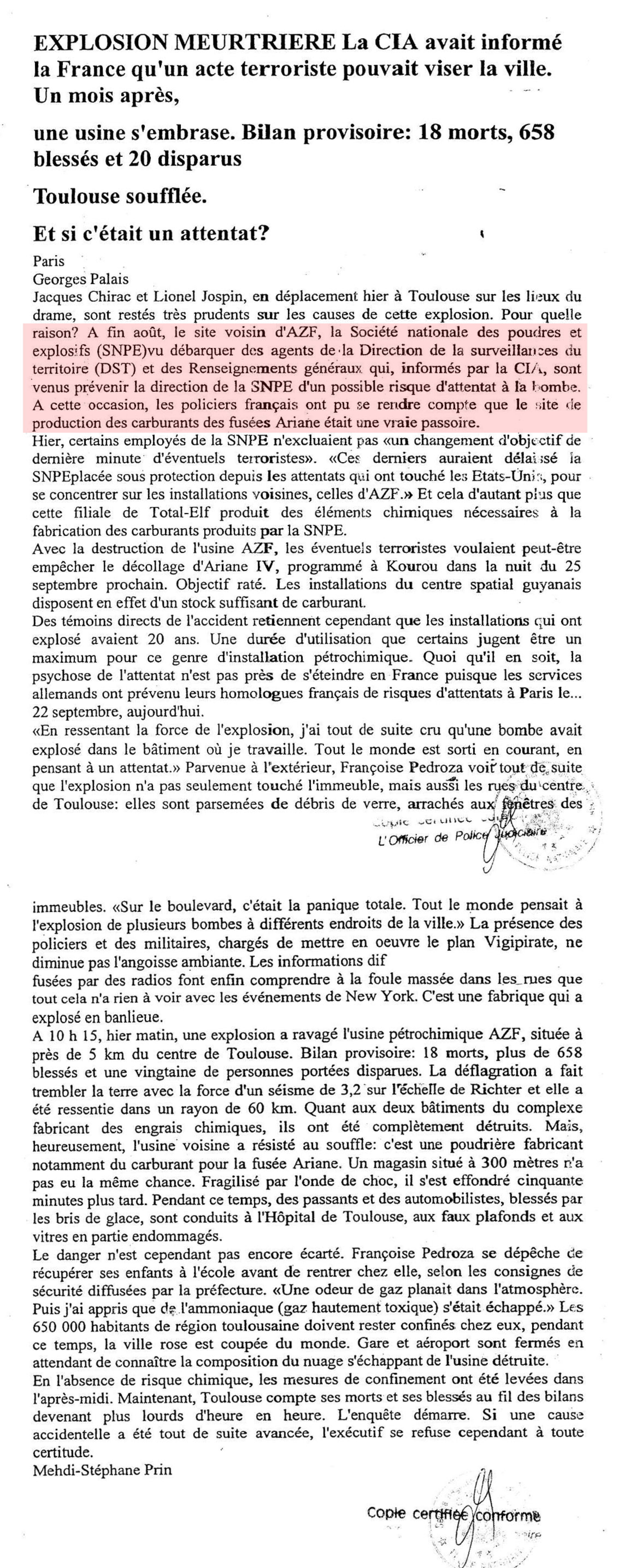 Le 22 septembre 2001, alors que le SRPJ et les experts commençaient déjà à préparer le terrain de l’accident chimique, excluant l’acte terroriste, le quotidien suisse Le Matin de Lausanne annonçait que la CIA avait déjà mis en alerte, fin août, la SNPE d’un risque d’attentat. La pièce a été introduite très tôt dans le dossier AZF-Toulouse à la cote D856.