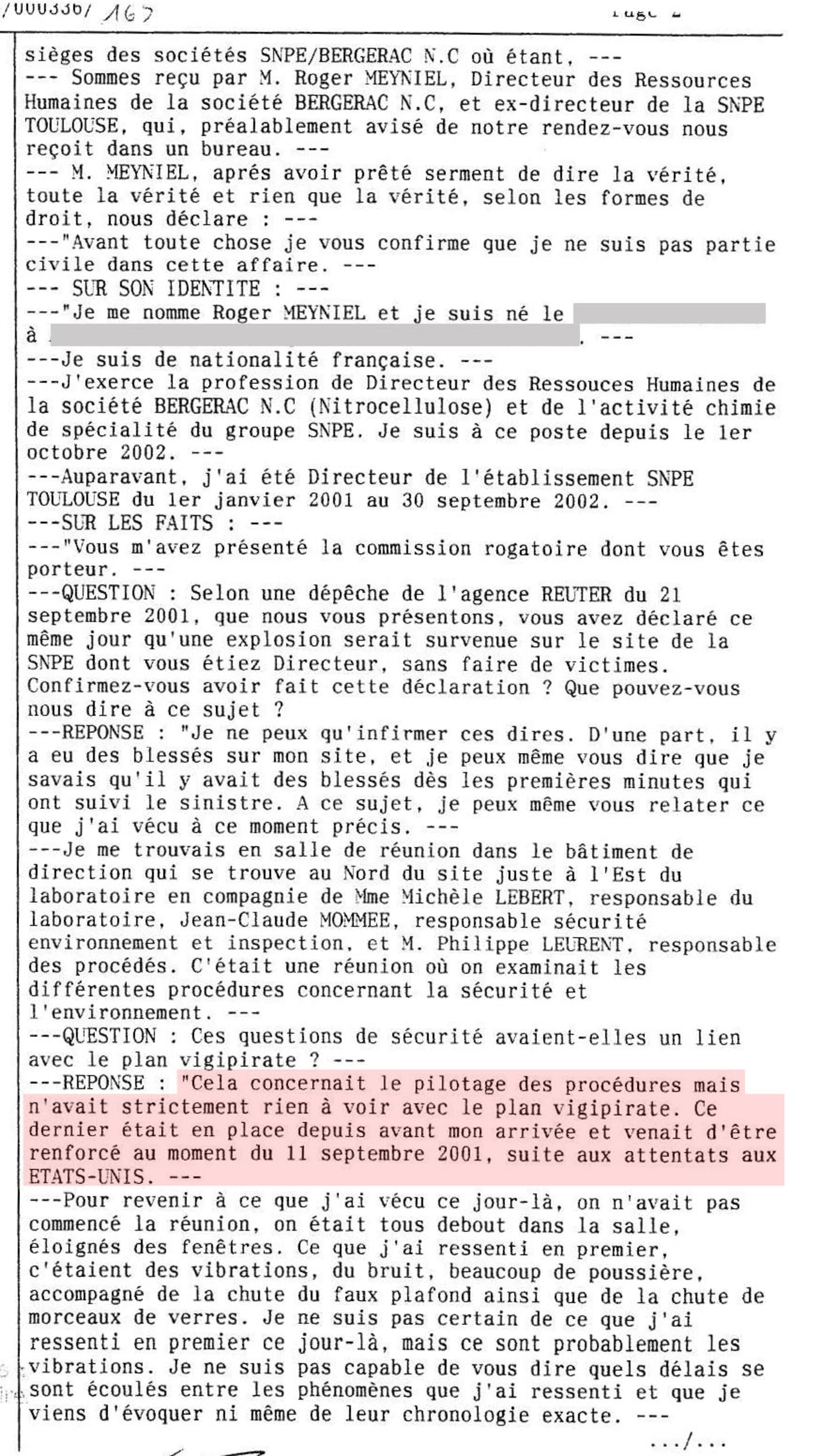 Au début de l’enquête AZF, les renforcements du plan Vigipirate établis depuis 1995 n’ont eu lieu, selon la direction de la SNPE, qu’après les événements new-yorkais du 11 septembre 2001 (attentats du WTC). C’est encore ce qu’affirmait devant le SRPJ le directeur du site SNPE, Roger Meyniel, dans la pièce D3235, le 17 mars 2003, soit 1 an et demi après la catastrophe.