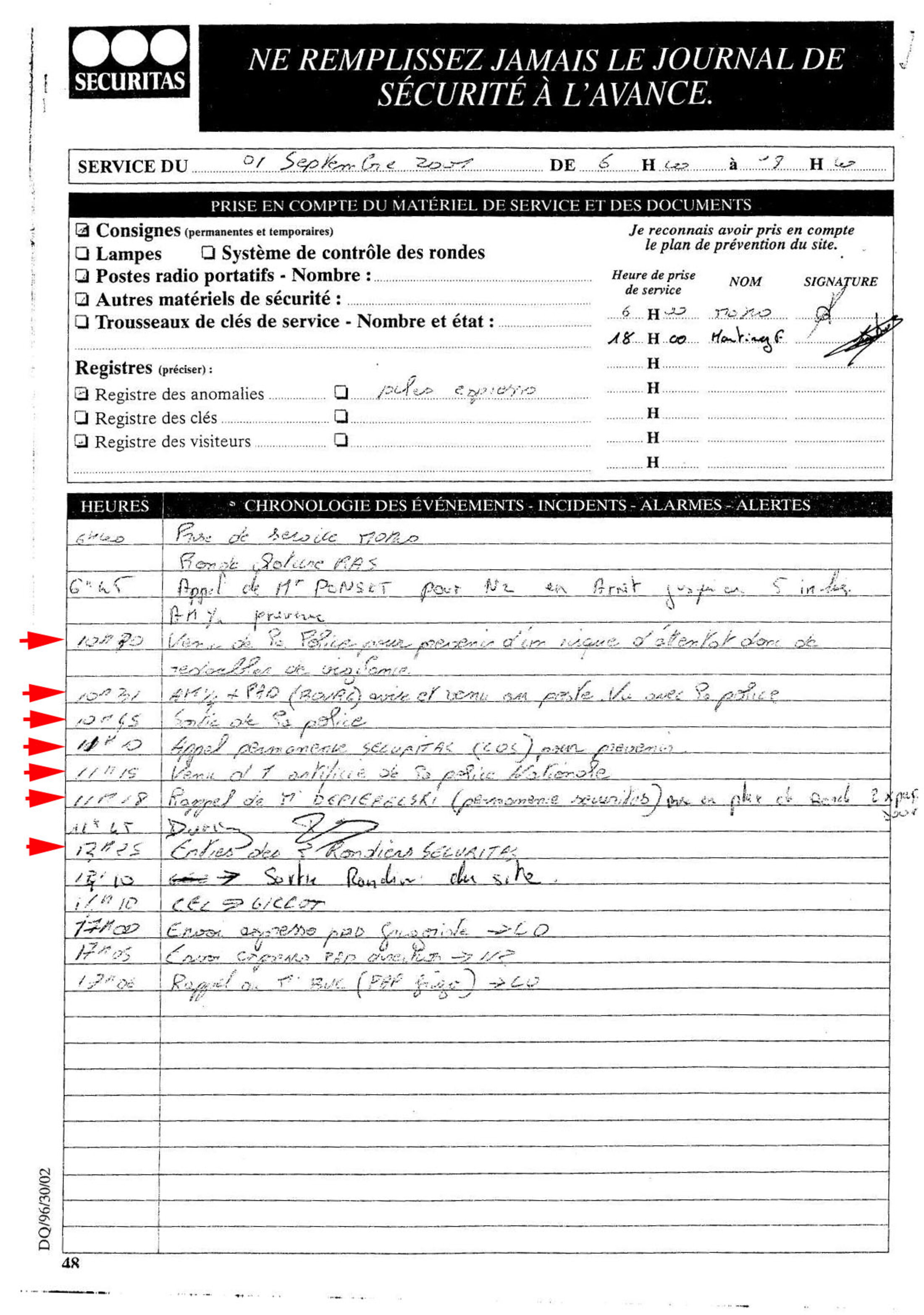 Le personnel de Sécuritas présents à la SNPE, les deux permanents du poste de garde du 1er septembre, ont tous indiqué que cette venue des policiers pour une telle alerte était exceptionnelle.
