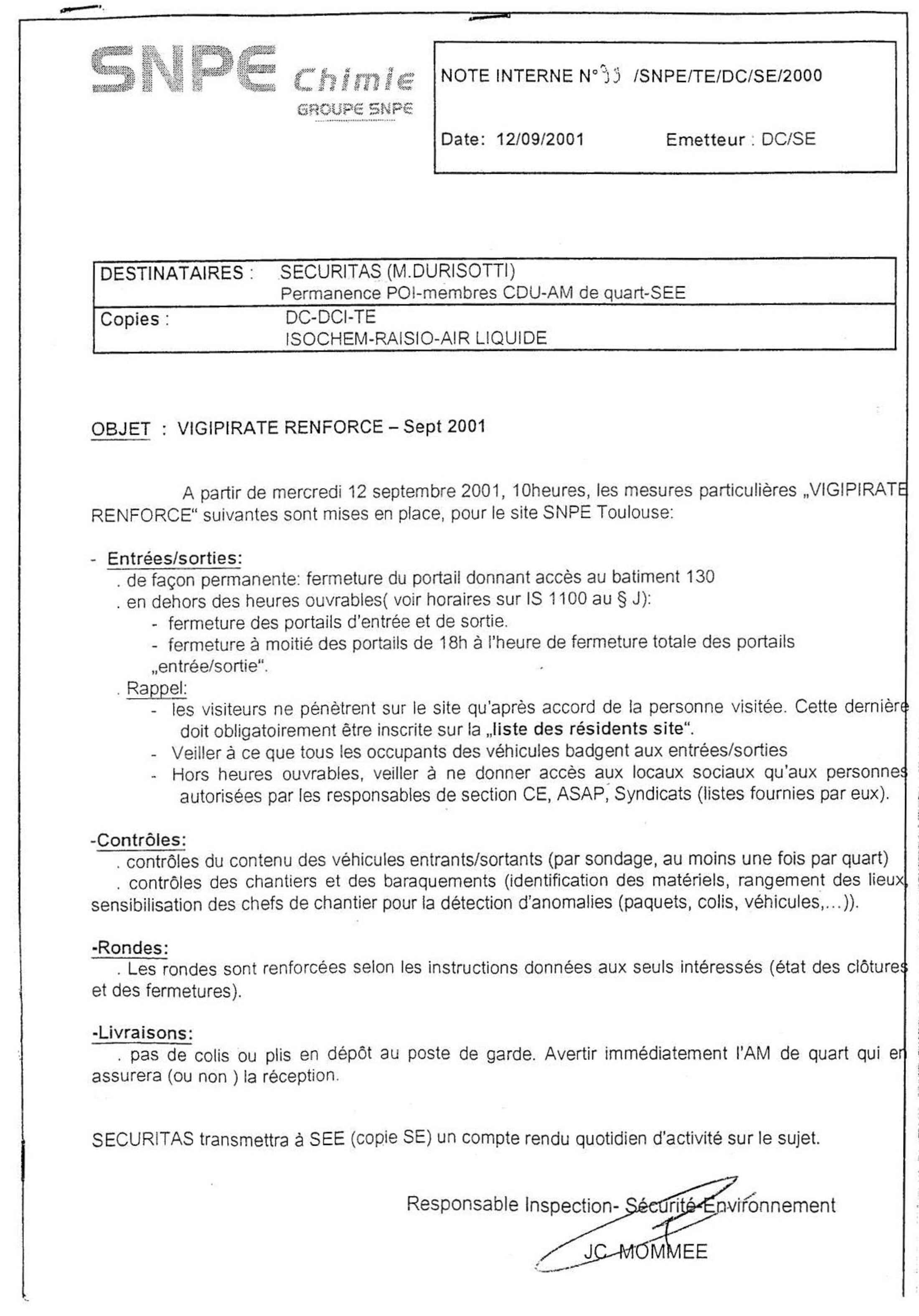 La SNPE et d’autres entreprises et administrations toulousaines ont été convoquées par la Préfecture, le 12 septembre 2001 vers 18h pour confirmer le Plan Vigipirate suite aux attentats du WTC aux USA. Mais l’usine AZF n’était pas concernée. Cette usine AZF a beau voir tout le trafic ferroviaire de la SNPE passer sur ses lignes électrifiées avant de rejoindre le réseau SNCF national, les deux usines ont beau être toutes les deux les héritières de la Grande Poudrerie militaire, les réseaux électriques, les réseaux d’eau, de gaz, de produits chimiques ont beau avoir des points géographiques communs, les usines ont beau parfois se partager le même personnel sous-traitant (CTRA, SCLE, etc…), la préfecture a semblé oublier l’importance de l’usine AZF dans ce cadre d’un plan Vigipirate. Etrange, étrange….!