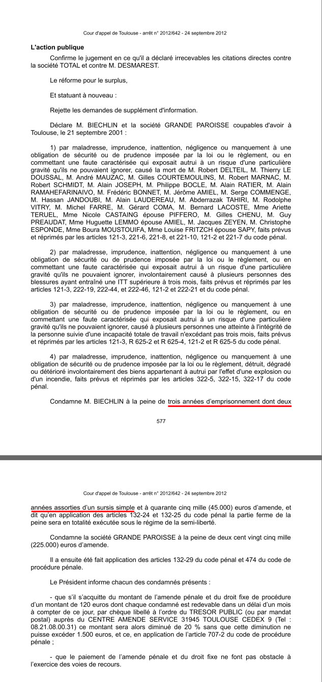 Alors que ce procès n'avait apporté aucun élément nouveau depuis 2009 permettant d'établir la moindre causalité dans les éléments de la thèse officielle de l'accident chimique, le délibéré condamna tout de même, avec beaucoup d'ardeur, le directeur de l'usine AZF, Serge Biechlin et la société Grande Paroisse, filiale du groupe Total, lui épargné par ce verdict, à des peines allant au delà de celles requises par l'avocat général, mais surtout, s'appuya sur un nouveau principe juridique : la culpabilité par défaut.