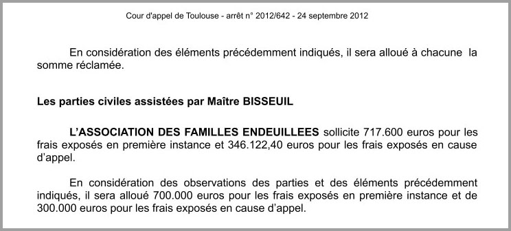 Pas des moindres puisqu'à elles seules, ces associations, mais surtout leurs avocats, représentent plus de 700 parties civiles et disposaient pendant ces quatre mois d'un avocat chacune. Les indemnisations pour l'association de Me Stella Bisseuil, à l'issu de ce délibéré battent un record : plus de 1.000.000 d'euros soit plus de 3 fois plus que le jugement de 2009 qui avait accordé 300.000 euros ! La FENVAC grapille bien plus en Appel qu'en première instance avec près de 50.000 euros !