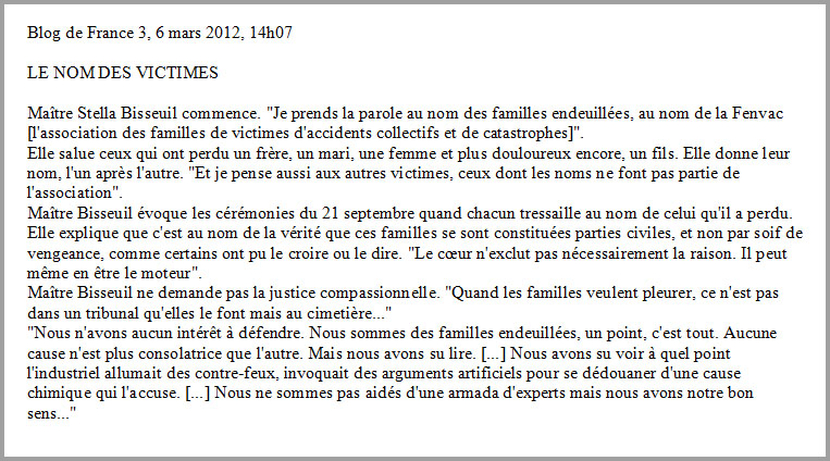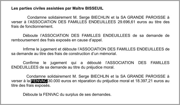 5- Au procès en Appel, la fédération nationale FENVAC s'est tout simplement fait représentée par... Me Stella Bisseuil, avocate de l'association des Familles Endeuillées, pour la plaidoirie... C'est tellement plus simple !