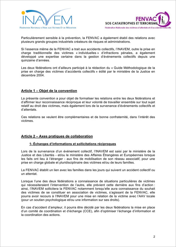 Rappelons-nous tout de même que la FENVAC et l'INAVEM, ont pour objet la défense des intérêts des victimes. Une autre convention nationale intéresse au plus haut point les associations de victimes dont les avocats ont touché des commissions de 5, 10 ou 20% sur le dos des indemnités de leurs clients. Cette Convention Nationale du 31 octobre 2001, signée par le Bâtonnier de l'ordre des avocats Jean-Louis Matheu, par le Ministère de la Justice, par le groupe Total et Grande Paroisse, par le Conseil Général de Haute-Garonne, par la Ville de Toulouse, par la SAVIM, etc... déconseillait fortement les avocats d'appliquer le principe de prélèvement automatique sur les frais de réparations au détriment des victimes, mais leur demandait de présenter leurs frais légitimes d'avocats auprès du responsable.
