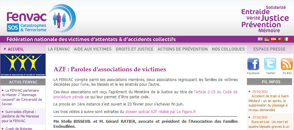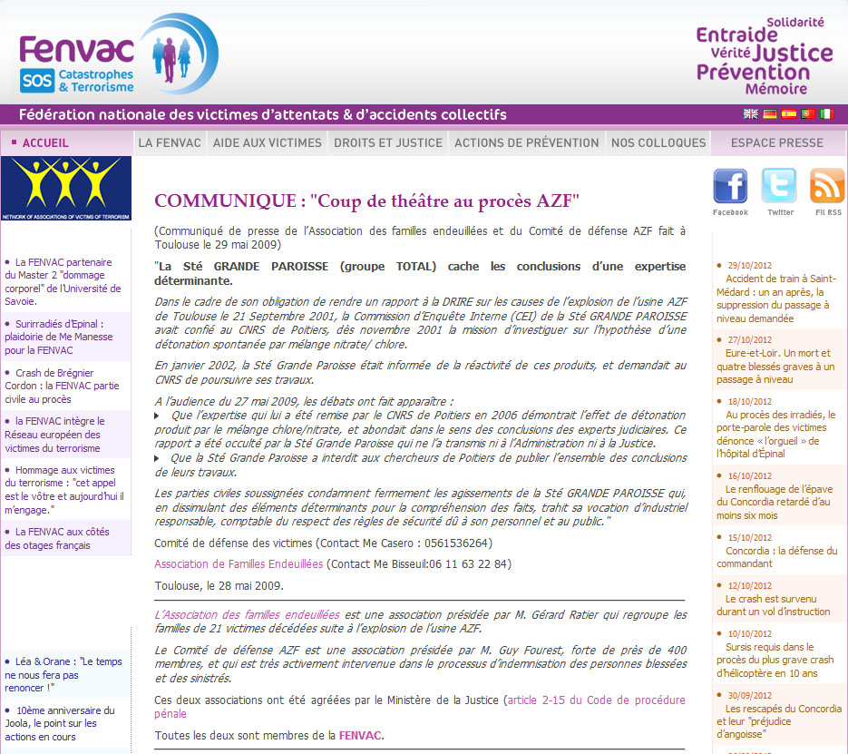 7- Le site internet de la FENVAC publie régulièrement tous les articles bienveillants pour les experts judiciaires et leur thèse officielle et accuse la défense de tous les maux concernant les causes de l'explosion. Elle donne même un droit de réponse à Me Bisseuil lorsque celle-ci veut répondre aux récentes propositions de thèse technique de la revue Préventique. Bref, la FENVAC a bien choisi ses membres et on a peu de chance d'y voir l'association AZF Mémoire et Solidarité ! Vu les positions du président de la FENVAC, il est clair que toute association de victimes qui mettraient en doute toute ou partie du travail des experts judiciaires de l'affaire AZF, n'avait aucune chance d'être admise dans ce club "bien pensant".