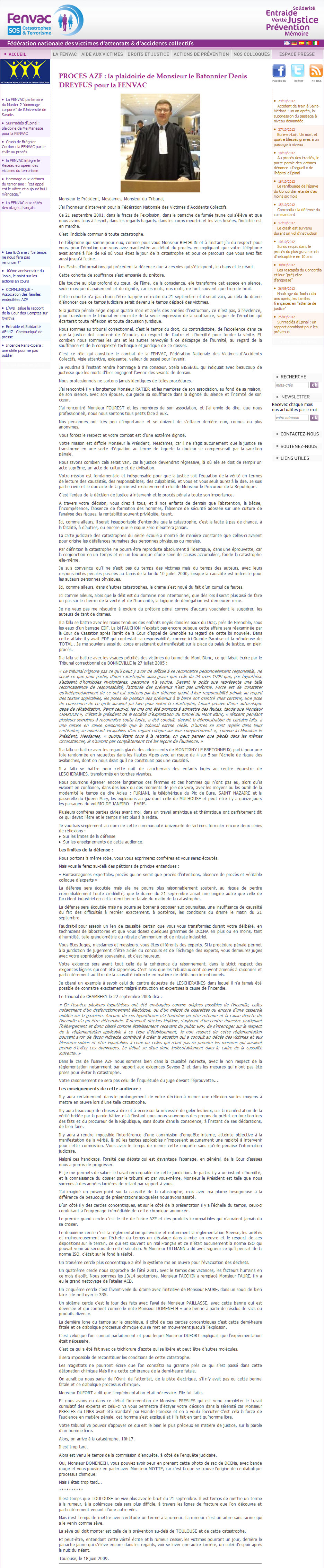 1- La FENVAC est une férération nationale d'associations d'aides aux victimes, comme son nom l'indique, qui s'est largement mouillée dans cette affaire AZF-Toulouse et pas seulement pour aider matériellement et moralement les associations de victimes.
