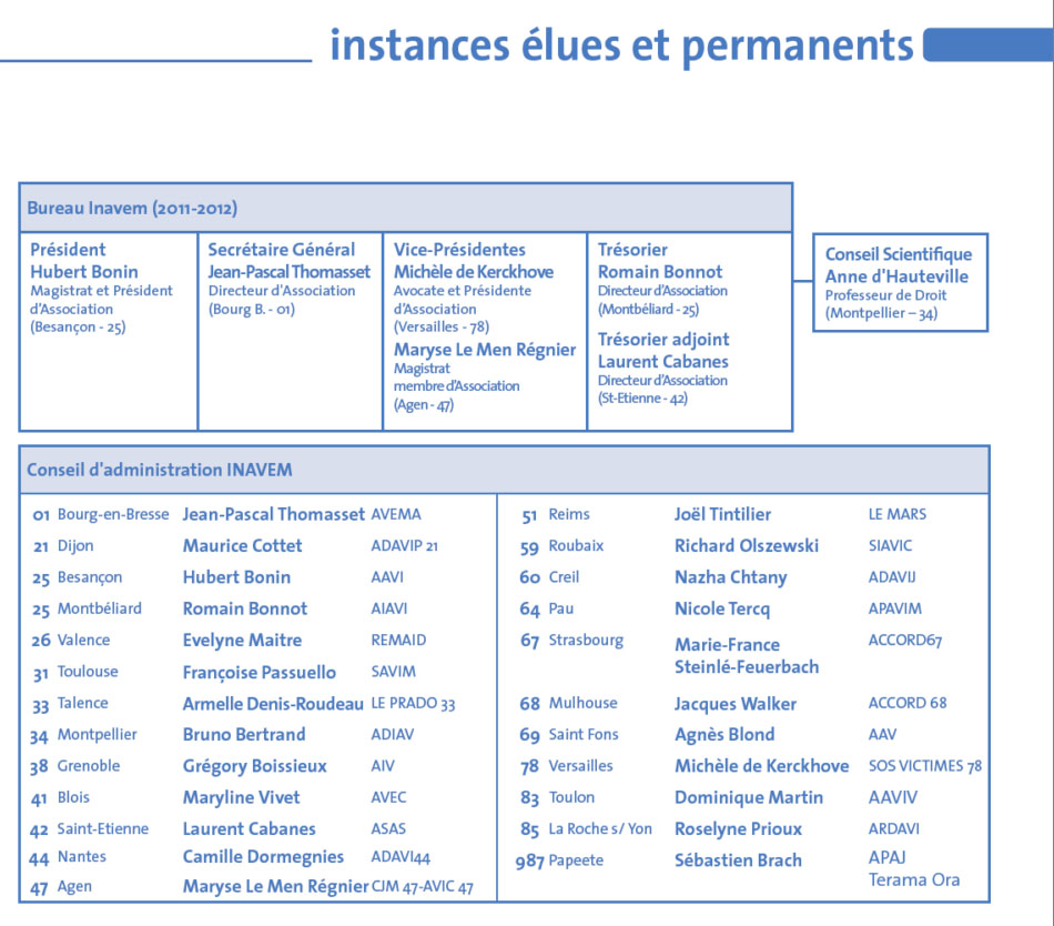 La juge Maryse le Men Régnier était depuis début 2011, vice-présidente de l'association INAVEM. Le 10 décembre 2011, cette association signe une convention de confiance et de collaboration mutuelles et d'échange d'informations avec la fédération FENVAC, partie civile impliquée aux deux procès AZF-Toulouse. >>> CONVENTION INAVEM-FENVAC du 10 Décembre 2011
