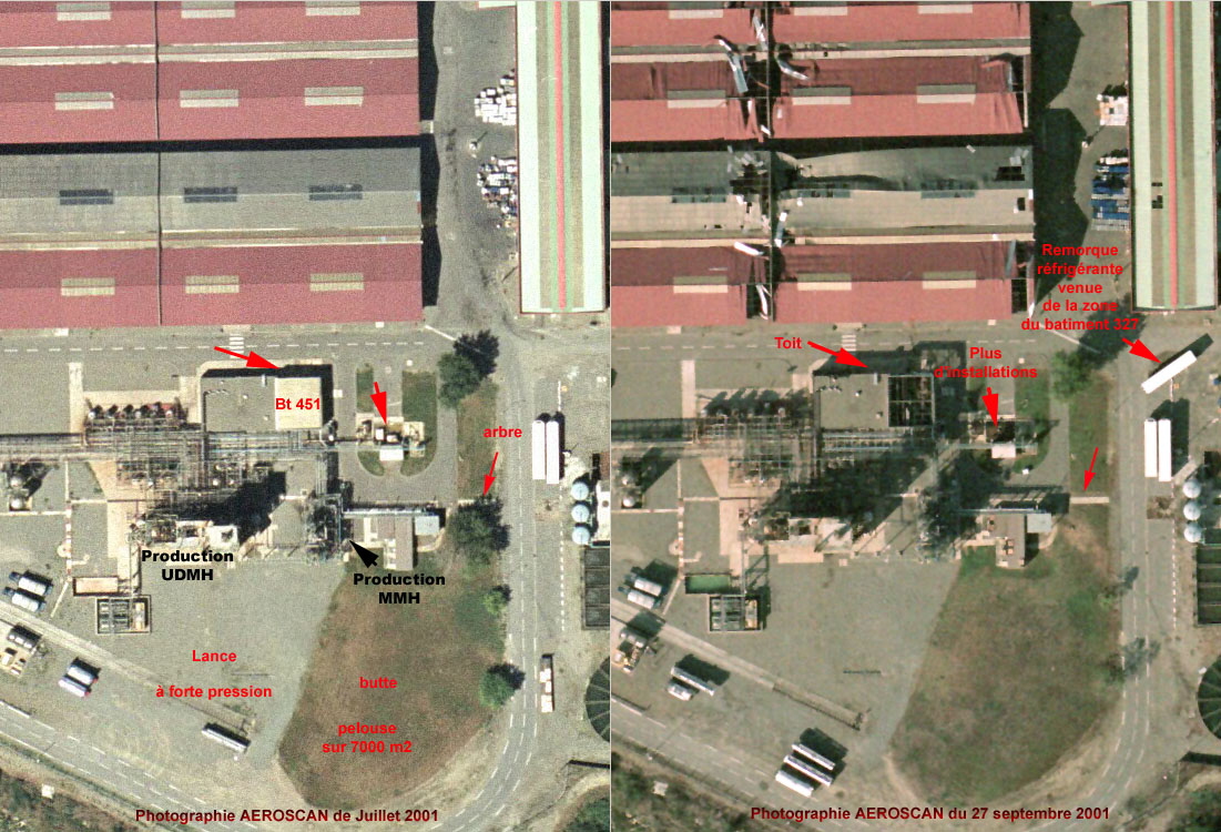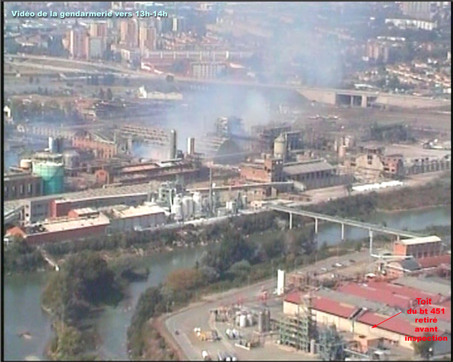 La SNPE serait aussi bienvenue d’expliquer ce qui existait, en 2001, sous le dôme végétal de 7000 m2 situé près de la station d’épuration au sud du site, sous protection d’une lance à incendie fixe de très forte pression. Cette zone a nécessité l’après-midi du 21 septembre 2001 l’intervention en urgence de remorques de refroidissement internes à la SNPE. Le toit du bâtiment 451 a été enfoncé mais prestement et entièrement retiré par la SNPE avant les expertises. Un arbre a aussi disparu entre la période de Juillet 2001 et le 27 septembre 2001. Les photographies aériennes AEROSCAN de septembre 2001 et la vidéo aérienne de la gendarmerie vers 13 heures en témoignent.